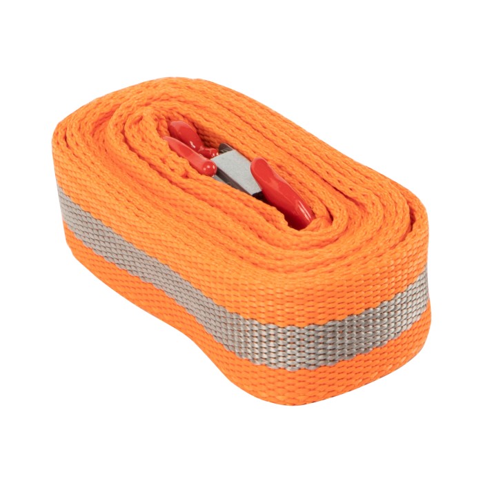 Трос буксировочный Stels 54375 с 2 крюками, в пакете, выдерживает нагрузки до 5 тонн. Будет полезен водителям при поломке легковых автомобилей, проблемах с двигателем, вытягивании транспортного средства из кювета, грязи и т.д.ПреимуществаНадежность — морозоустойчивый авиационный капрон не разрушается от резких перепадах температур и влажности, обладает высокой стойкостью к износу и не растягивается в процессе эксплуатации.Удобная эксплуатация — два крюка позволяют легко зацепить трос, а также сделать дополнительную петлю.Безопасная буксировка — 5-метровый трос удерживает авто на оптимальном расстоянии, а благодаря оранжевому цвету он хорошо заметен на дороге.Компактность — ленточный плоский трос весом 415 г легко скручивается в рулон и помещается в багажнике.Гарантированное качество — изделие соответствует требованиям ПДД и основным положениям допуска ТС к эксплуатации.Удобная транспортировка и хранение — трос поставляется в индивидуальной упаковке.