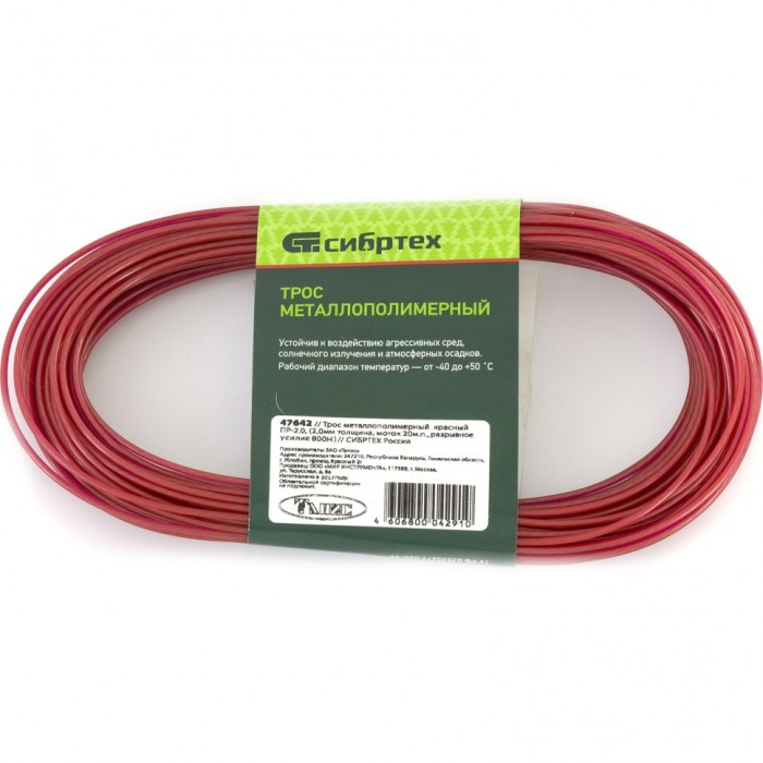 Металлополимерный трос ПР-2.0 Сибртех 47642 красного цвета, толщиной 2,0 мм, в мотке 20 метров, используется для монтажа баннеров и рекламных растяжек, погружения скважинных насосов и датчиков, установки тентов и теплиц,...