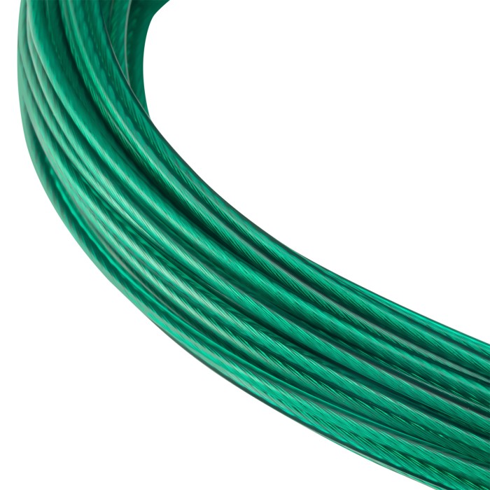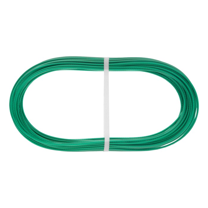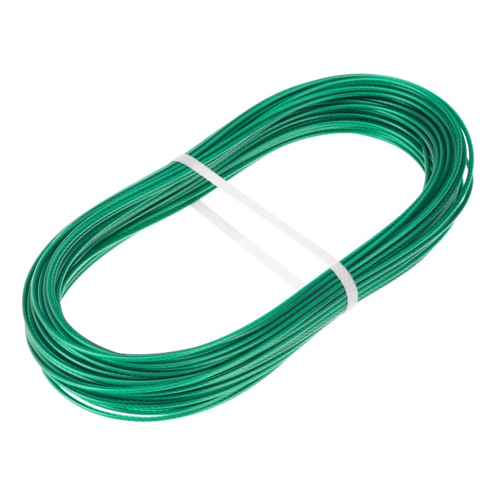 Металлополимерный трос ПР-2.0 Сибртех 47645 зеленого цвета, толщиной 2,0 мм, в мотке 20 метров, используется для монтажа баннеров и рекламных растяжек, погружения скважинных насосов и датчиков, установки тентов и теплиц,...