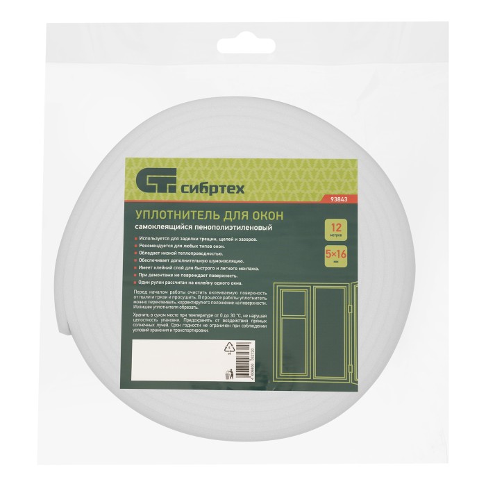 Самоклеящийся уплотнитель для окон Сибртех 93843 размером 5 мм х 16 мм х 12 м обеспечивает тепло- и шумоизоляцию, предотвращает образование сквозняков, попадание пыли. Может использоваться в жилых, производственных и ины...