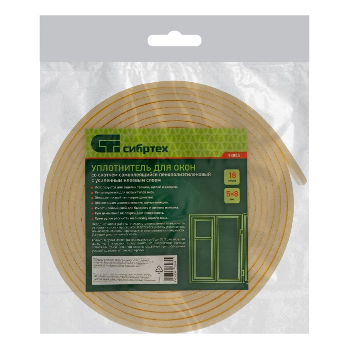 Уплотнитель для окон Сибртех 93855 со скотчем, сечением 5 х 8 мм и длиной 18 м используется для теплоизоляции жилых помещений, магазинов, складов и т.д. Изделие также обеспечивает звукоизоляцию, препятствует попаданию пы...