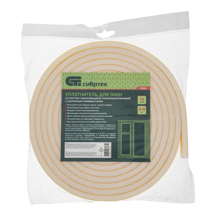 Уплотнитель для окон Сибртех 93858 со скотчем, сечением 8 х 8 мм и длиной 14 м используется для теплоизоляции жилых помещений, магазинов, складов и т.д. Изделие также обеспечивает звукоизоляцию, препятствует попаданию пыли, образованию сквозняков, благодаря чему в помещении формируется комфортный микроклимат.ПреимуществаУниверсальность — лента крепко фиксируется на деревянных, металлических, пластиковых поверхностях.Надежность — уплотнитель выполнен из прочного материала на основе пенополиэтилена.Эффективная герметизация — изделие устойчиво к перепадам температур и воздействию влаги.Эластичность — лента легко принимает форму оклеиваемой поверхности и не мешает открывать и закрывать оконные створки.Защитный бумажный слой — клеящий состав не высыхает во время хранения.