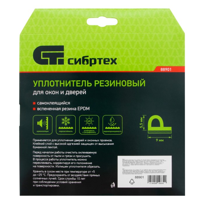Белый резиновый уплотнитель Сибртех 88901 длиной 24 м, с профилем «P», предназначен для герметизации и уплотнения оконных и дверных блоков с целью предотвращения сквозняков и вибраций, защиты от влаги и пыли, создания эффективной тепло- и звукоизоляции. Клеевой слой обеспечивает высокую адгезию и надежную фиксацию. Использование уплотнителя позволяет значительно снизить энергетические и экономические затраты. Лента с P-профилем 9 x 5,5 мм подойдет для щелей размером 3-5 мм.ПреимуществаДолговечность — уплотнитель изготовлен из износостойкой вспененной резины EPDM.Устойчивость к разрушению — утеплитель не боится воздействия ультрафиолета.Эластичность — уплотнитель легко восстанавливает форму после сжатия, не твердеет в течение всего срока использования.Надежность — материал уплотнителя водонепроницаем и выдерживает большие колебания температуры.Удобное хранение — бумажная лента защищает клейкий слой от высыхания.