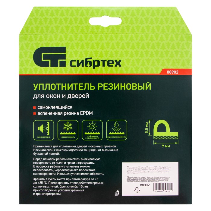 Коричневый резиновый уплотнитель Сибртех 88902 длиной 24 м, с профилем «P», предназначен для герметизации и уплотнения оконных и дверных блоков с целью предотвращения сквозняков и вибраций, защиты от влаги и пыли, создания эффективной тепло- и звукоизоляции. Клеевой слой обеспечивает высокую адгезию и надежную фиксацию. Использование уплотнителя позволяет значительно снизить энергетические и экономические затраты. Лента с P-профилем 9 x 5,5 мм подойдет для щелей размером 3-5 мм.ПреимуществаДолговечность — уплотнитель изготовлен из износостойкой вспененной резины EPDM.Устойчивость к разрушению — утеплитель не боится воздействия ультрафиолета.Эластичность — уплотнитель легко восстанавливает форму после сжатия, не твердеет в течение всего срока использования.Надежность — материал уплотнителя водонепроницаем и выдерживает большие колебания температуры.Удобное хранение — бумажная лента защищает клейкий слой от высыхания.
