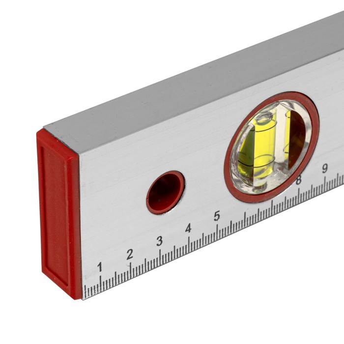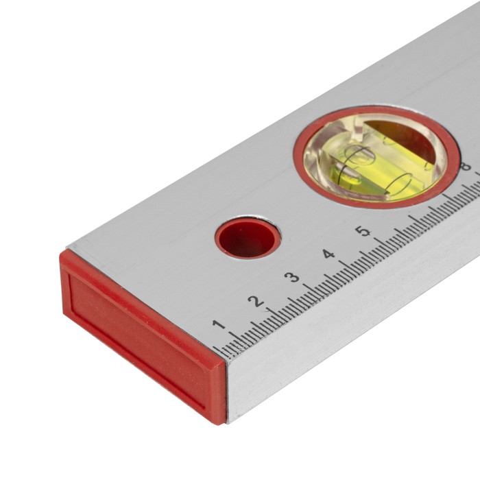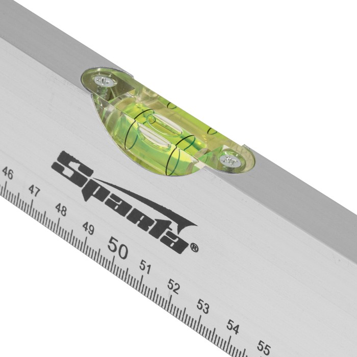 Алюминиевый уровень Sparta 35110 длиной 1000 мм, с 2 глазками и линейкой, рассчитан на применение в быту и в производственных условиях. Он поможет добиться точного выстраивания разметочных линий для последующей установки конструкций, полок, укладки облицовочных материалов и т.д. Две пузырьковые ампулы обеспечивают точный контроль отклонений поверхностей от горизонтальной и вертикальной плоскостей.,Для определения отклонения вертикали 90 градусов необходимо использовать пузырьковую ампулу только в верхнем положении уровня. Только базовая поверхность является рабочей (противоположная ампуле 180 градусов).ПреимуществаАнодированный алюминиевый профиль, из которого выполнен уровень, отличается прочностью и антикоррозионными свойствами.На корпусе имеется шкала, позволяющая осуществлять линейные измерения.Благодаря отверстию в корпусе инструмент можно хранить в подвешенном виде.