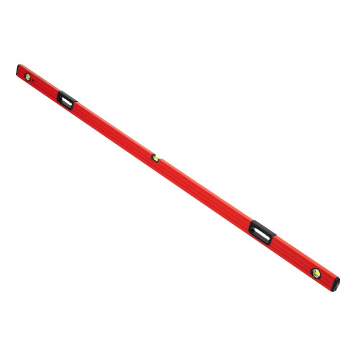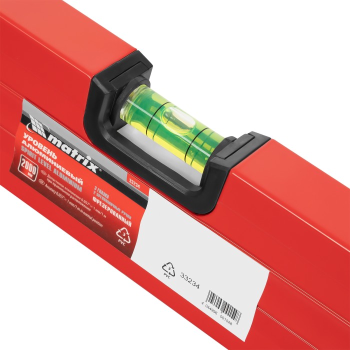 Фрезерованный алюминиевый уровень Matrix 33234 длиной 2000 мм, с 3 глазками и 2 эргономичными ручками, поможет проверить горизонтальные и вертикальные поверхности, выставить угол 45 градусов. Он будет полезен на любом этапе строительства и ремонта: при облицовке и отделке поверхностей, монтаже конструкций и т.д. Погрешность измерений на метр не превышает 1 мм (0,057 градуса).,Для определения отклонения вертикали 90 градусов необходимо использовать пузырьковую ампулу только в верхнем положении уровня. Только базовая поверхность является рабочей (противоположная ампуле 180 градусов).ПреимуществаДолговечность — корпус изготовлен из легкого, но прочного алюминиевого профиля.Надежность — глазки уровня выполнены из акрила, по обеим сторонам корпуса имеются резиновые заглушки, предотвращающие попадание пыли и мелкого мусора.Удобство работы — строительный уровень оснащен эргономичными рукоятками.V-образная подошва — форма уровня позволяет делать замеры на трубах.Высокая точность — рабочая плоскость прибора фрезерована.Измерительная шкала — строительный уровень можно использовать в качестве линейки.