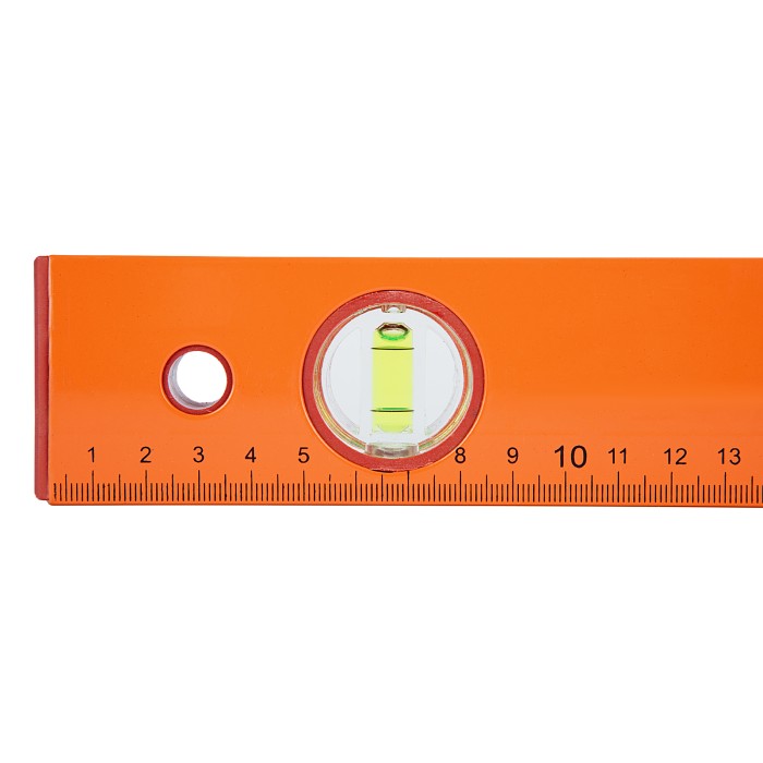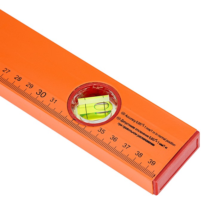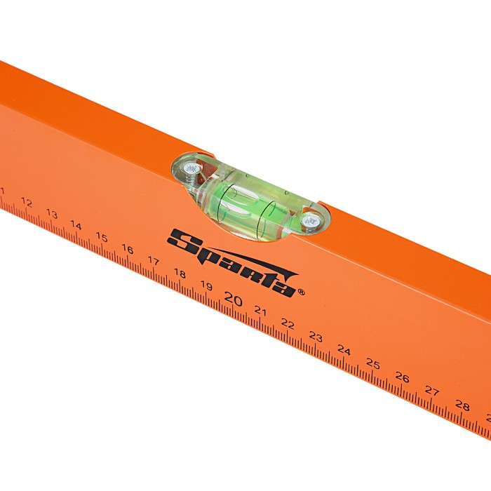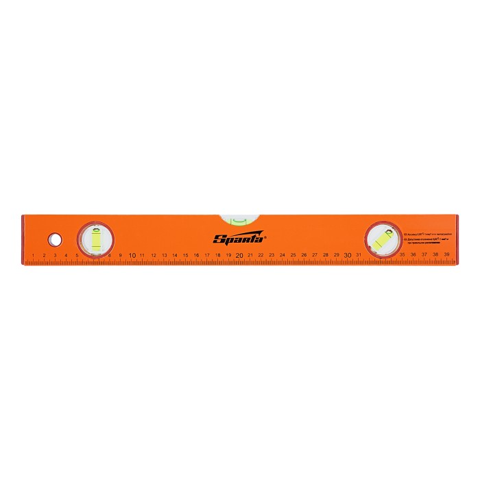 Алюминиевый уровень Sparta 330205 длиной 400 мм, желтого цвета, с 3 глазками и линейкой, будет полезен при проведении строительных, отделочных, облицовочных и других работ, требующих особой точности. Уровень с тремя глазками поможет определить отклонение от горизонтальной и вертикальной плоскости, выставить угол 45°, измерить предметы и т. д.ПреимуществаНадежность — уровень изготовлен из алюминиевого профиля.Защита от пыли и строительного мусора — инструмент снабжен торцевыми заглушками.Функциональность — благодаря измерительной шкале можно начертить линию нужной длины.Точность выполняемых измерений — погрешность составляет 1 мм/м (0,057°).Для определения отклонения от вертикали 90° необходимо использовать пузырьковую ампулу только в верхнем положении уровня. Только базовая поверхность (противоположная ампуле 180°) является рабочей.