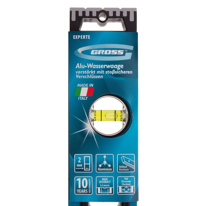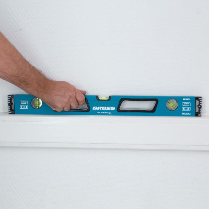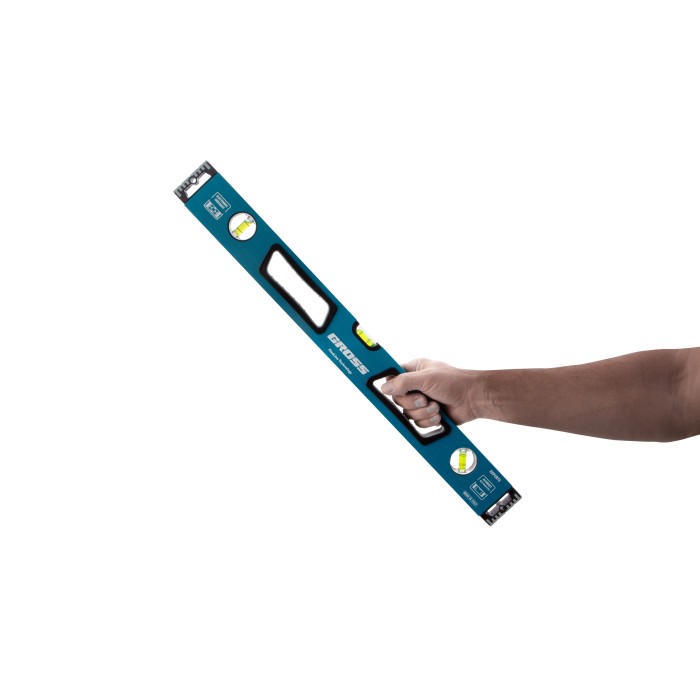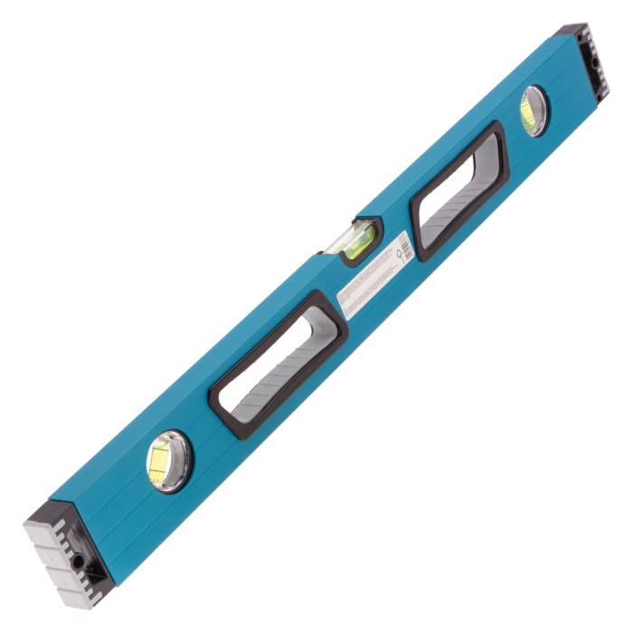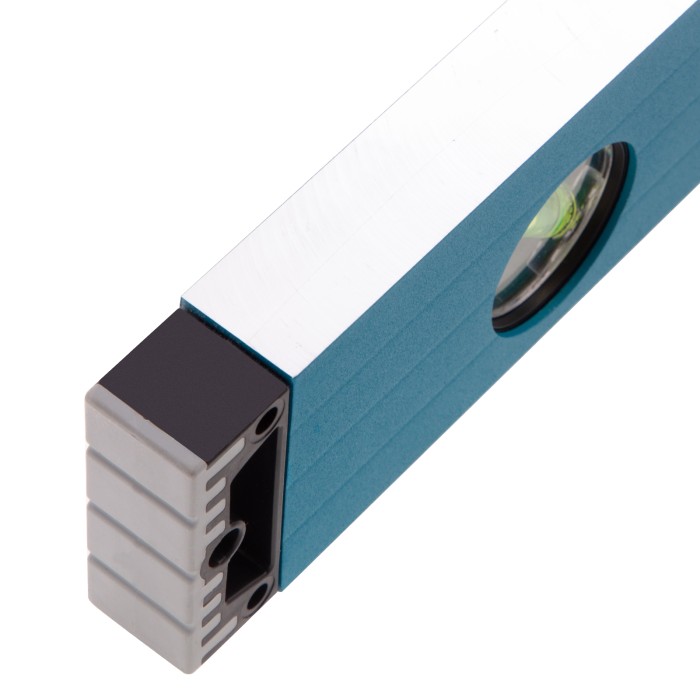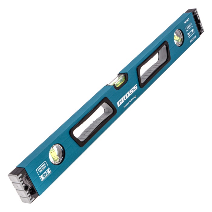 Усиленный алюминиевый уровень Gross 34326 длиной 600 мм, с ударопрочными заглушками, рукоятками и 3 глазками, — универсальный инструмент для решения профессиональных задач на строительной площадке. Благодаря ему можно выровнять поверхности относительно горизонтали и вертикали или проверить соответствие углу 45 градусов.ПреимуществаУсиленная конструкция — двухкамерный алюминиевый профиль повышает стойкость к скручиванию и обеспечивает долгий срок службы уровня.Эффективная работа — благодаря фрезерованной подошве погрешность измерений сведена к минимуму.Комфортная эксплуатация — резиновые рукоятки предотвращают проскальзывание инструмента в руках.Ударопрочность — двухкомпонентные заглушки обеспечивают сохранность инструмента при падениях с небольшой высоты.Удобное хранение — боковые отверстия служат для подвешивания инструмента на крючок.Для определения отклонения вертикали 90 градусов необходимо использовать пузырьковую ампулу только в верхнем положении уровня. Только базовая поверхность является рабочей (противоположная ампуле 180 градусов).