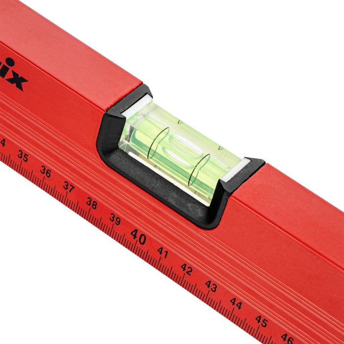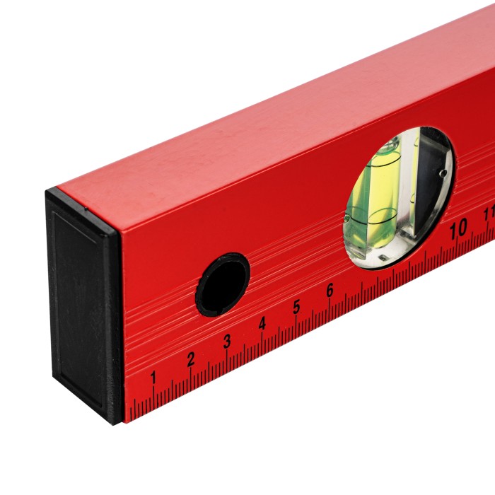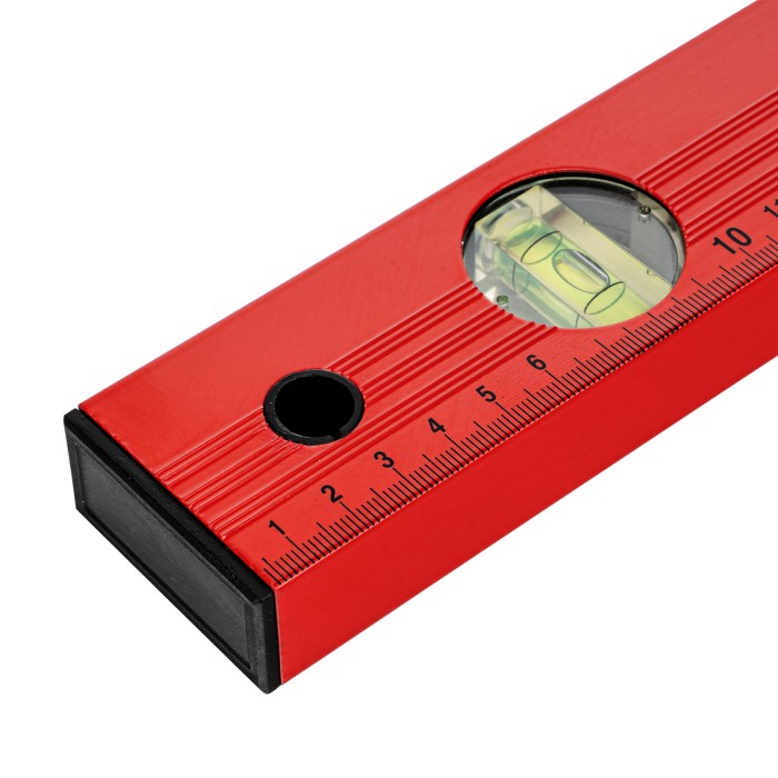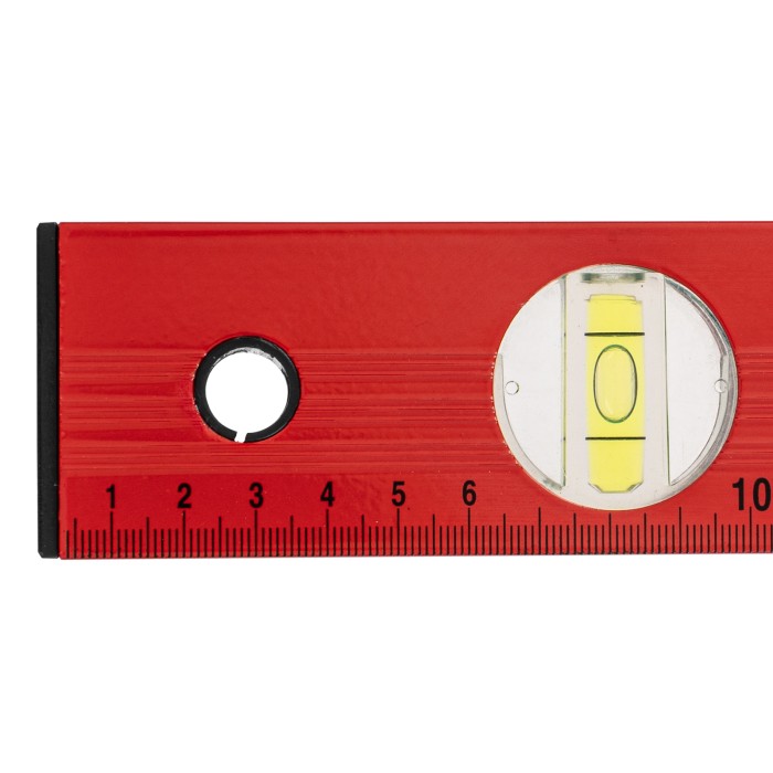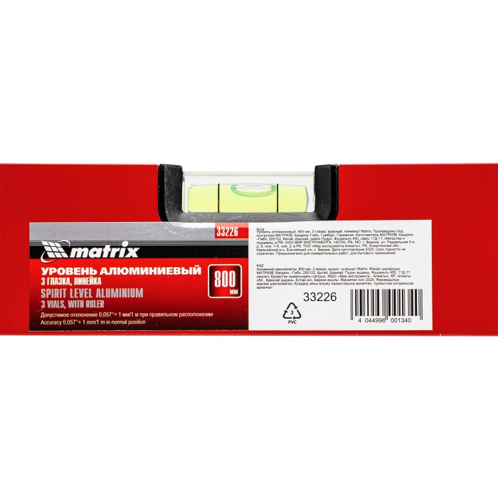Алюминиевый уровень Matrix 33226 длиной 800 мм, красного цвета, с 3 глазками и линейкой, пригодится при проведении строительных, ремонтных и монтажных работ. С ним повышается точность работы, что позволяет добиться качественного результата. Три колбы рассчитаны на проверку горизонтали, вертикали и угла 45 градусов, погрешность равна 1 мм/м (0,057 градуса).,Для определения отклонения вертикали 90 градусов необходимо использовать пузырьковую ампулу только в верхнем положении уровня. Только базовая поверхность является рабочей (противоположная ампуле 180 градусов).ПреимуществаДолговечность уровня достигается за счет корпуса из упрочненного алюминиевого профиля.Торцевые заглушки предотвращают попадание мусора внутрь инструмента.Окрашенный корпус не подвержен воздействию агрессивных веществ.Мерная шкала на корпусе уровня позволяет использовать его в качестве линейки.