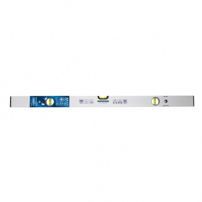 Уровень алюминиевый фрезерованный Gross 33672 длиной 800 мм, магнитный, с 3 глазками, — незаменимый инструмент в быту и на строительной площадке. Позволяет выявить погрешности измерений, отклонения от заданной вертикали и горизонтали.ПреимуществаКонструкционная прочность — инструмент изготовлен из алюминиевого профиля, пузырьковые камеры имеют двойные стенки.Фиксация на металлических поверхностях — производитель предусмотрел встроенные магниты.Погрешность 05 мм/м — базовая поверхность уровня фрезерована, пузырьковые ампулы установлены с электронным контролем точности.Гарантированное качество — инструмент изготовлен в Италии под строгим технологическим контролем.Для определения отклонения вертикали 90° необходимо использовать пузырьковую ампулу только в верхнем положении уровня. Только базовая поверхность (противоположная ампуле 180°) является рабочей.