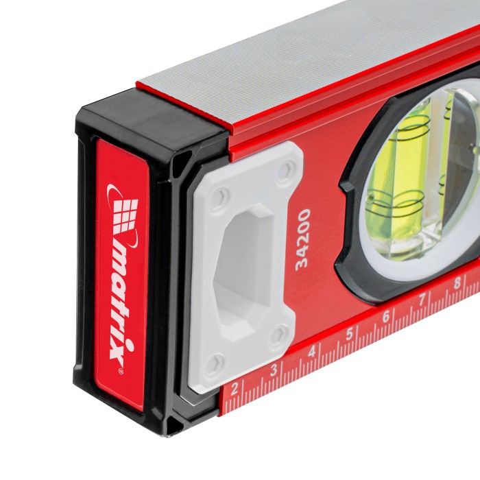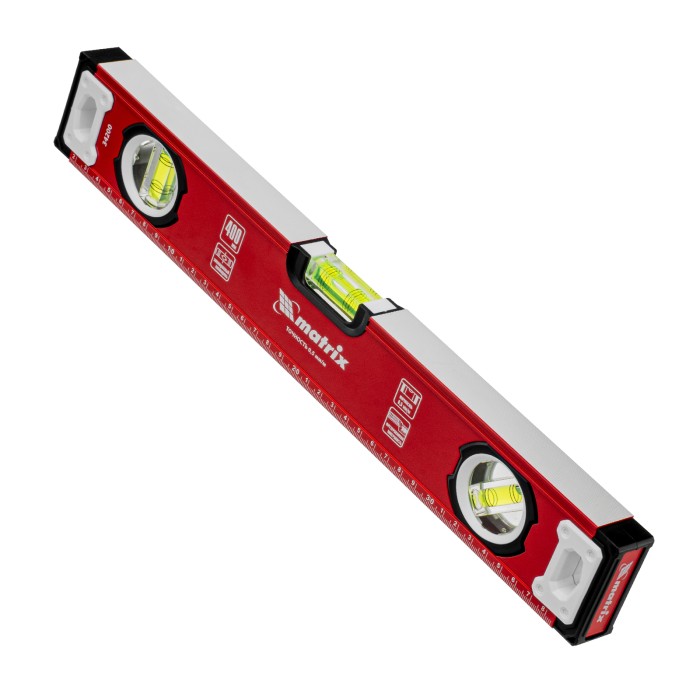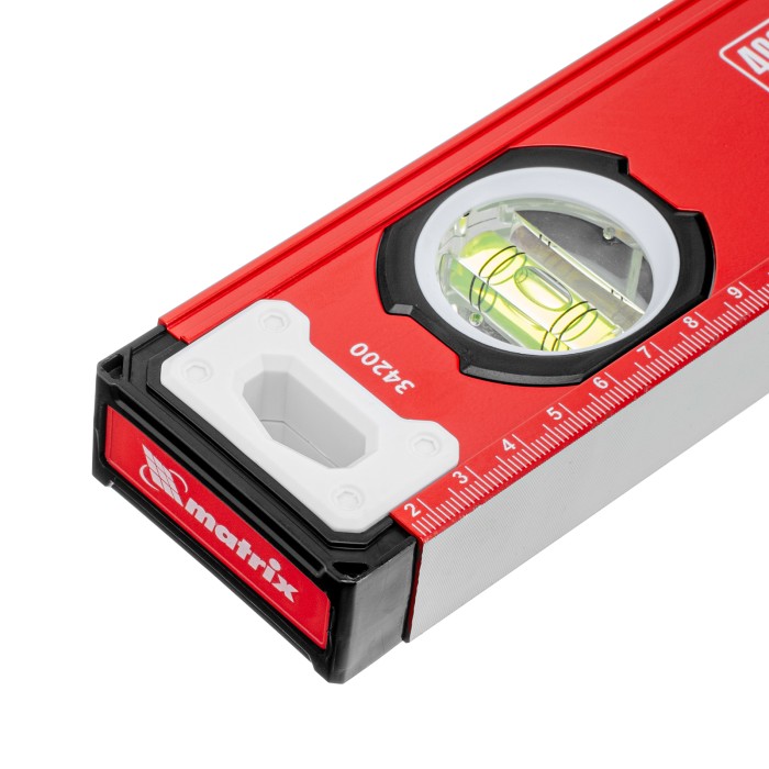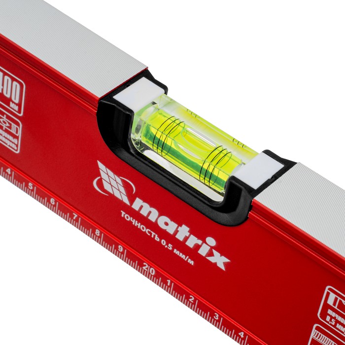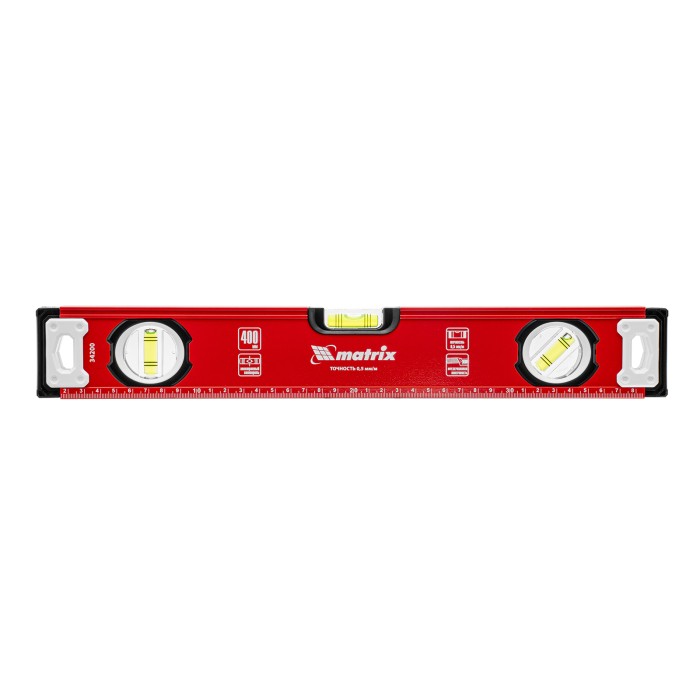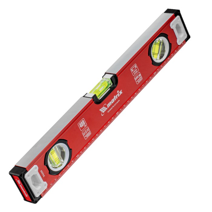 Уровень алюминиевый фрезерованный Matrix 34200 длиной 400 мм, с 3 глазками, предназначен для определения отклонений от горизонтальной и вертикальной поверхностей и угла 45°. Обеспечивает высокую точность полученных результатов, пригодится для выполнения строительных и отделочных работ.ПреимуществаВысокий показатель прочности — уровень изготовлен из алюминиевого профиля.Точные результаты — глазки прошли электронную калибровку на заводе, рабочая поверхность фрезерована, что позволило снизить погрешность до 0,5мм/м.Удобная работа с металлическими поверхностями — для фиксации инструмента предусмотрены встроенные магниты.Дополнительные возможности — измерительная шкала позволяет определить размер предметов, заготовок и т. д.
