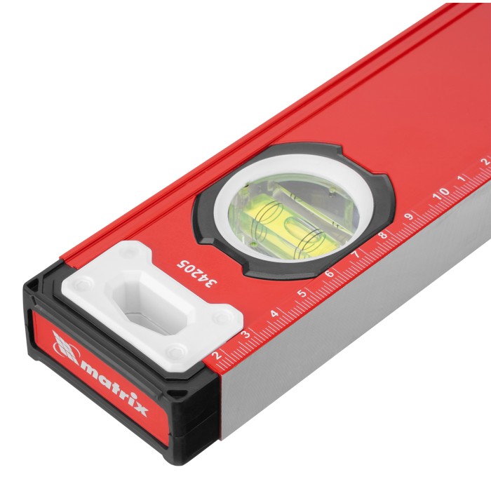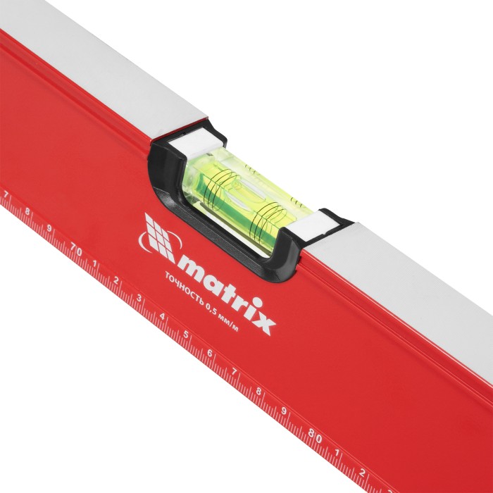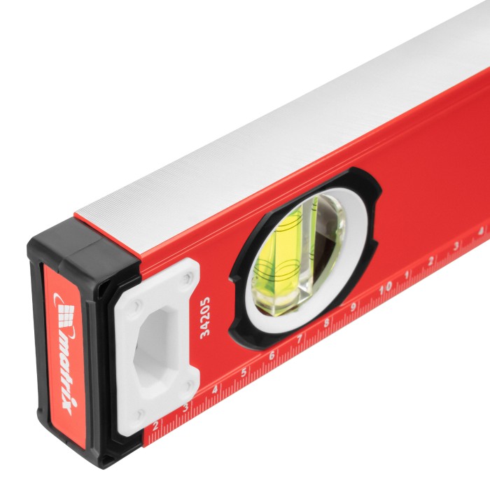 Алюминиевый фрезерованный уровень Matrix 34205 длиной 1500 мм, с 3 глазками и рукоятками, позволяет обнаружить отклонения от вертикали и горизонтали, а также выставить диагональ. Инструмент будет полезен на строительной площадке, при выполнении ремонтных и монтажных работ.ПреимуществаНадежность — уровень изготовлен из алюминиевого профиля, колбы установлены с использованием электронной калибровки.Высокая точность выполняемых работ — рабочая поверхность фрезерована для снижения погрешности измерений.Эргономичность — благодаря отверстиям в корпусе инструмент удобно удерживать.Использование в качестве линейки — на корпус нанесена измерительная шкала.Для определения отклонения вертикали 90° необходимо использовать пузырьковую ампулу только в верхнем положении уровня. Только базовая поверхность (противоположная ампуле 180°) является рабочей.