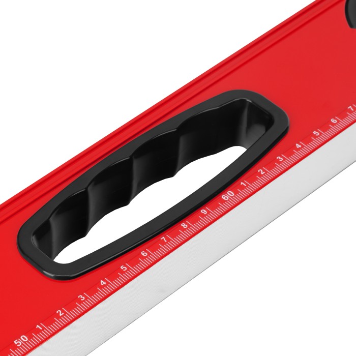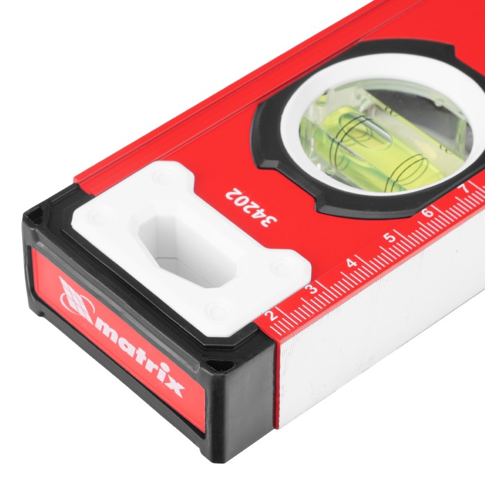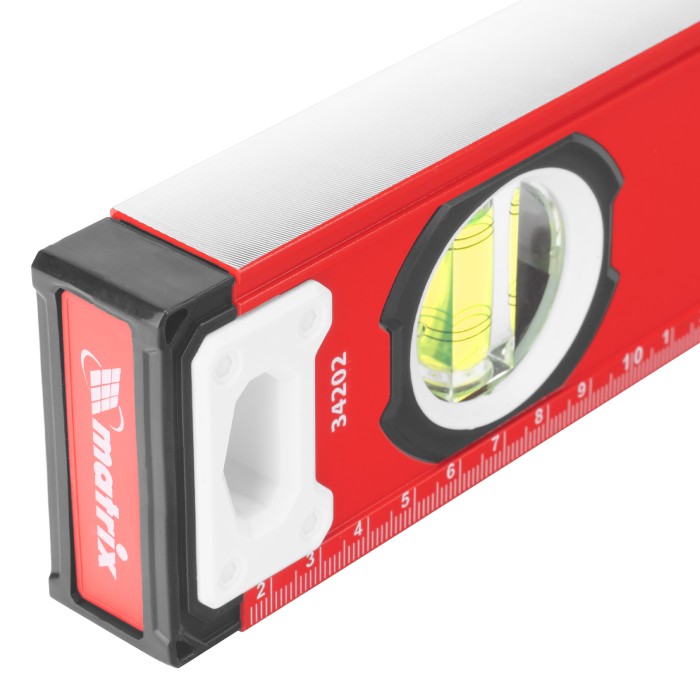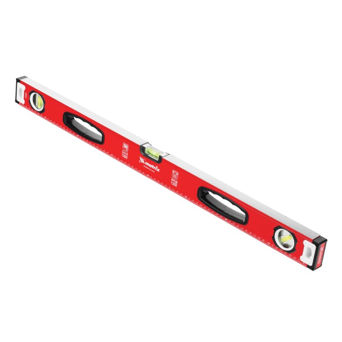 Алюминиевый фрезерованный уровень Matrix 34202 длиной 800 мм, с 3 глазками и рукоятками, позволяет обнаружить отклонения от вертикали и горизонтали, а также выставить диагональ. Инструмент будет полезен на строительной площадке, при выполнении ремонтных и монтажных работ.ПреимуществаНадежность — уровень изготовлен из алюминиевого профиля, колбы установлены с использованием электронной калибровки.Высокая точность выполняемых работ — рабочая поверхность фрезерована для снижения погрешности измерений.Эргономичность — благодаря отверстиям в корпусе инструмент удобно удерживать.Использование в качестве линейки — на корпус нанесена измерительная шкала.Для определения отклонения вертикали 90° необходимо использовать пузырьковую ампулу только в верхнем положении уровня. Только базовая поверхность (противоположная ампуле 180°) является рабочей.