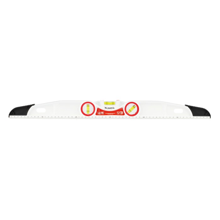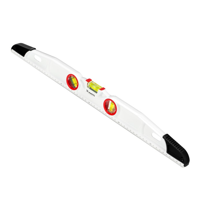 Уровень алюминиевый литой Matrix 34911 длиной 600 мм, с фрезерованной рабочей частью, 3 глазками и двумя ударными площадками, предназначен для проверки поверхностей на отклонение от горизонтали, вертикали и угла 45°. Инс...