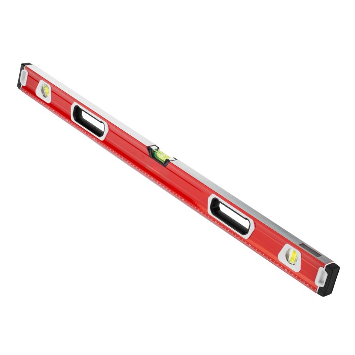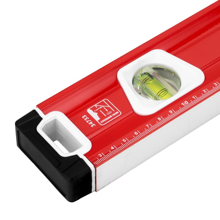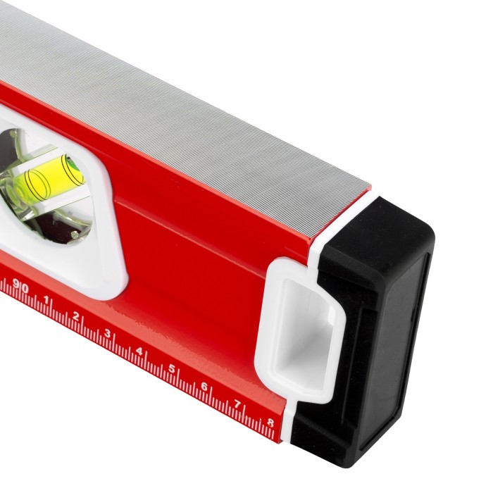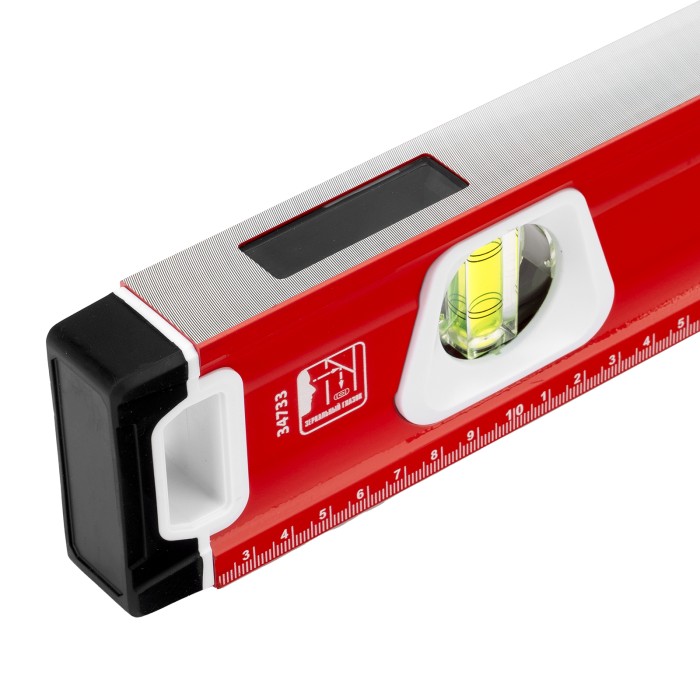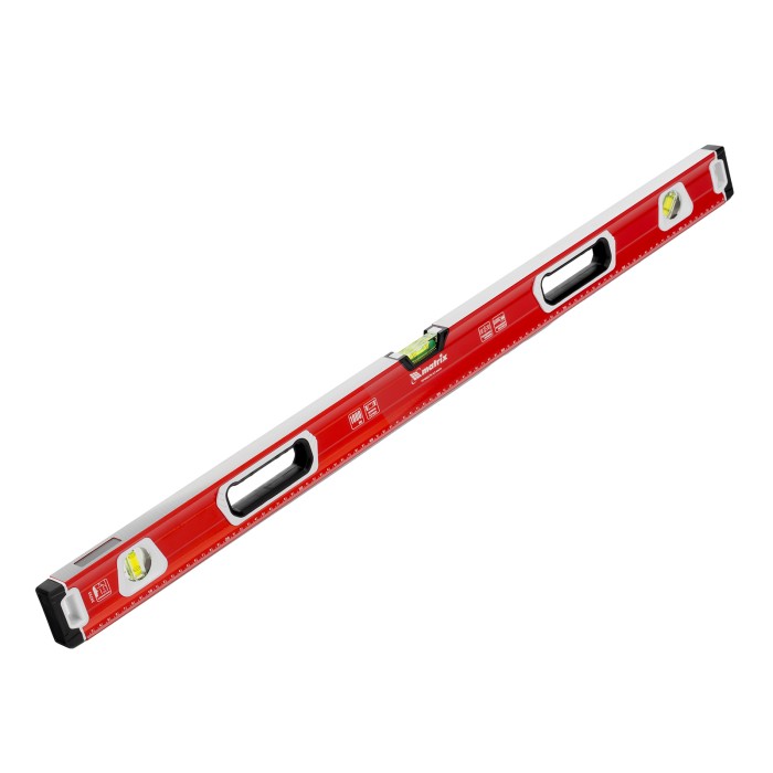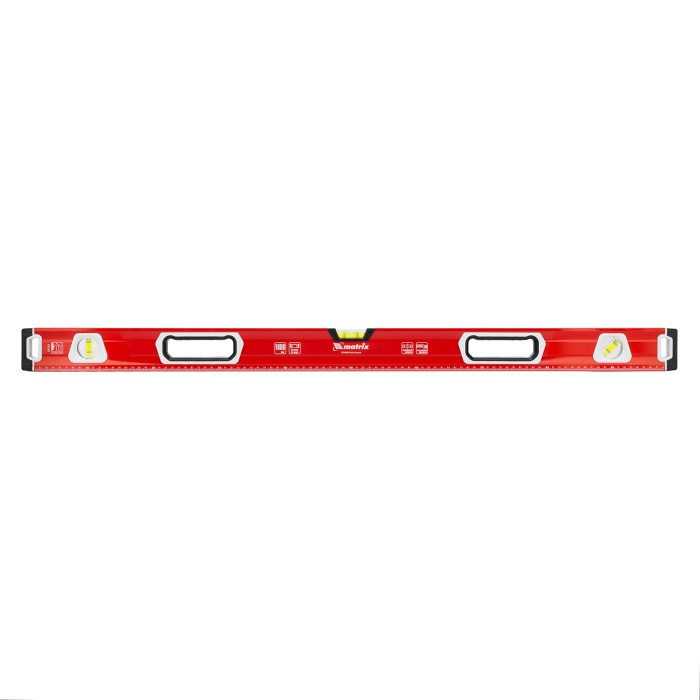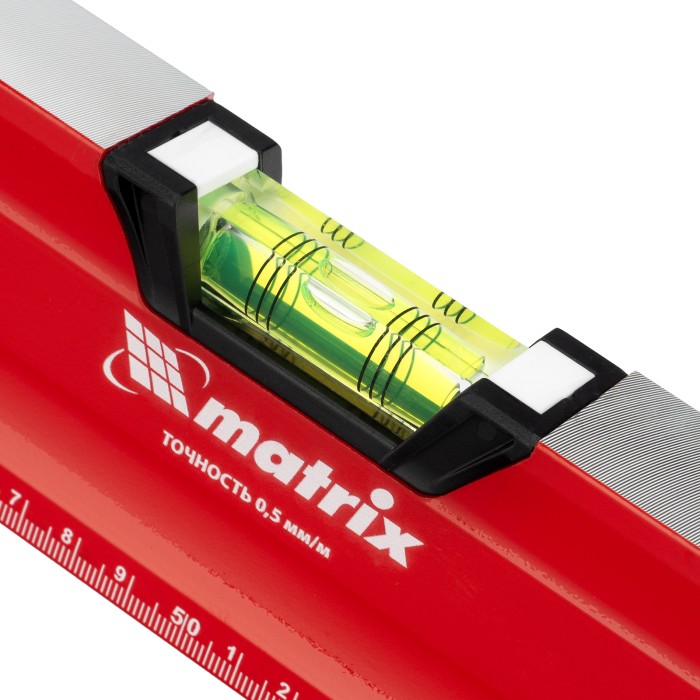 Уровень алюминиевый фрезерованный Matrix 34733 длиной 1000 мм, с магнитной полосой и 2-компонентными рукоятками, 3 глазками и 1 зеркальным отражателем, — измерительный инструмент для контроля отклонений поверхностей от горизонтали, вертикали и угла 45°. Используется для выполнения работ, требующих высокой точности.ПреимуществаПрочность и долговечность — корпус изготовлен из алюминиевого профиля, устойчивого к образованию коррозии.Высокая точность проводимых работ — электронная калибровка глазков уровня и фрезеровка рабочей грани позволили снизить погрешность измерений до 0,5 мм/м.Продуманная конструкция — в корпусе имеются рукоятки для удобного захвата инструмента и 2 отверстия для организации подвесного хранения.Дополнительные возможности — измерительная шкала на корпусе позволяет использовать уровень в качестве линейки.Для определения отклонения от вертикали 90° необходимо использовать пузырьковую ампулу только в верхнем положении уровня. Только базовая поверхность (противоположная ампуле 180°) является рабочей.