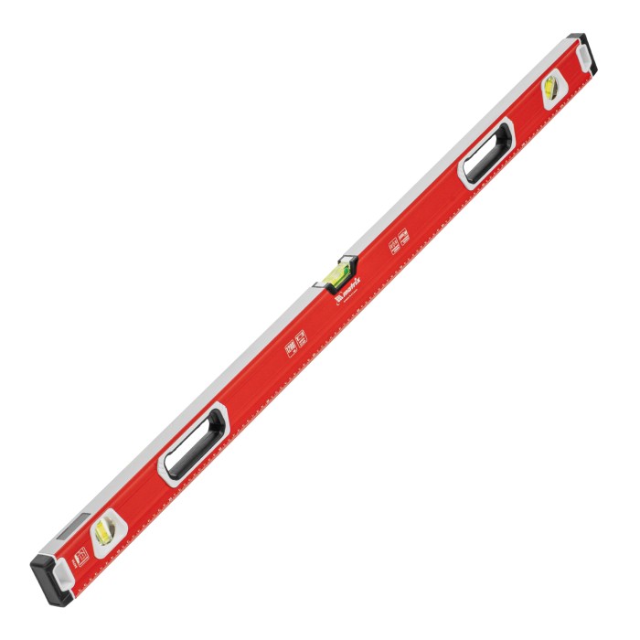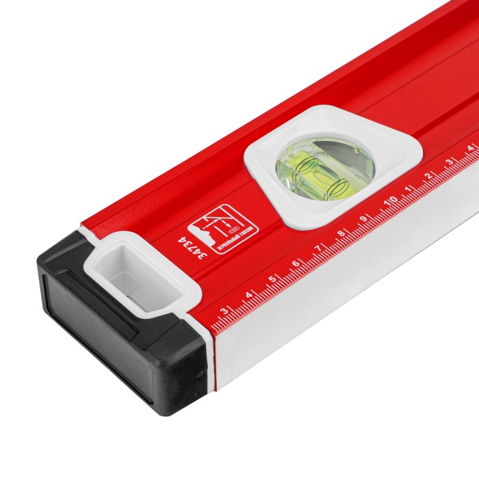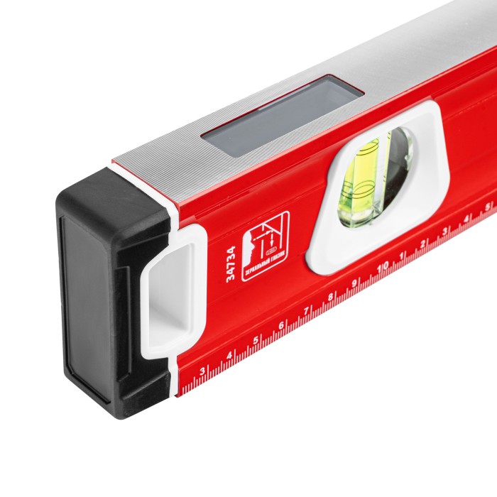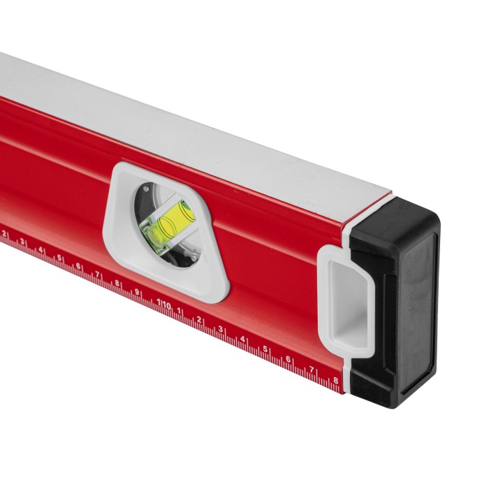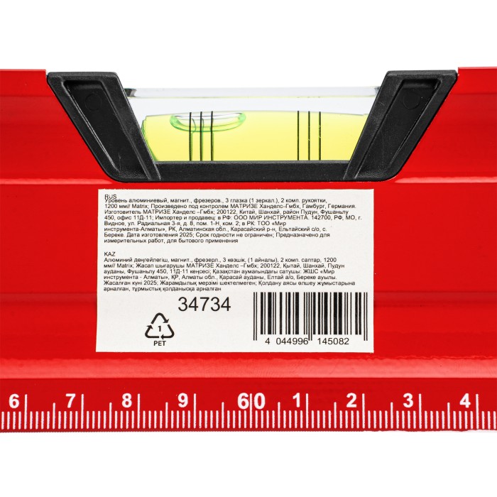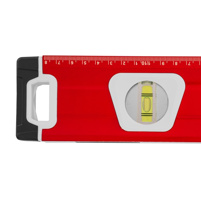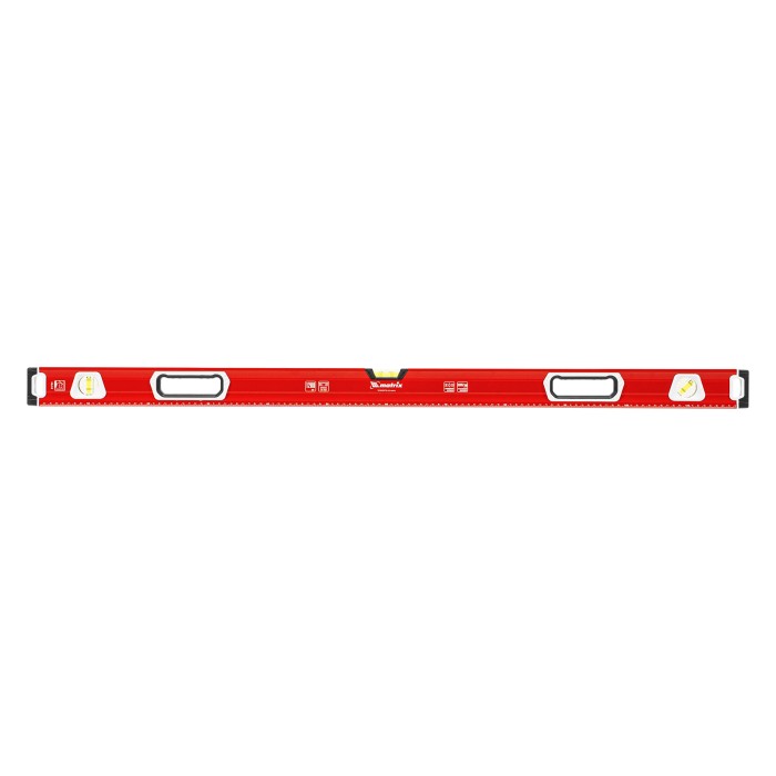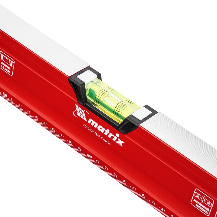 Уровень алюминиевый фрезерованный Matrix 34734 длиной 1200 мм, с магнитной полосой и 2-компонентными рукоятками, 3 глазками и 1 зеркальным отражателем, — измерительный инструмент для контроля отклонений поверхностей от горизонтали, вертикали и угла 45°. Используется для выполнения работ, требующих высокой точности.ПреимуществаПрочность и долговечность — корпус изготовлен из алюминиевого профиля, устойчивого к образованию коррозии.Высокая точность проводимых работ — электронная калибровка глазков уровня и фрезеровка рабочей грани позволили снизить погрешность измерений до 0,5 мм/м.Продуманная конструкция — в корпусе имеются рукоятки для удобного захвата инструмента и 2 отверстия для организации подвесного хранения.Дополнительные возможности — измерительная шкала на корпусе позволяет использовать уровень в качестве линейки.Для определения отклонения от вертикали 90° необходимо использовать пузырьковую ампулу только в верхнем положении уровня. Только базовая поверхность (противоположная ампуле 180°) является рабочей.