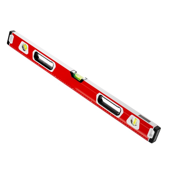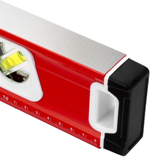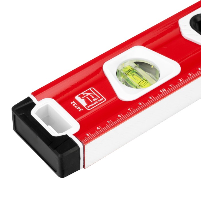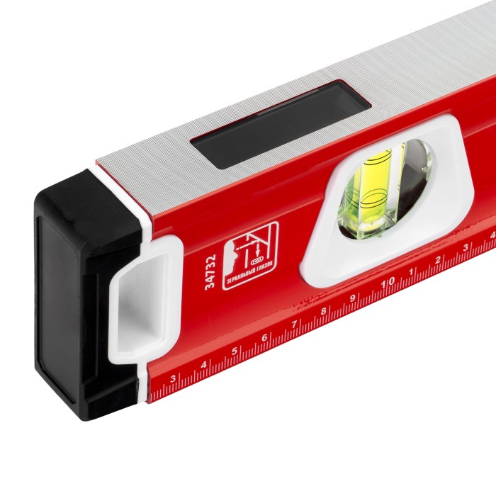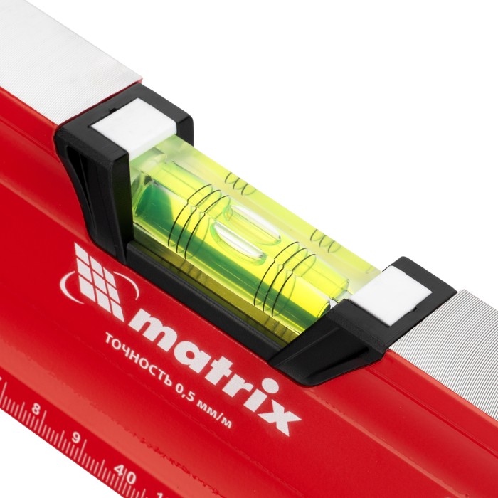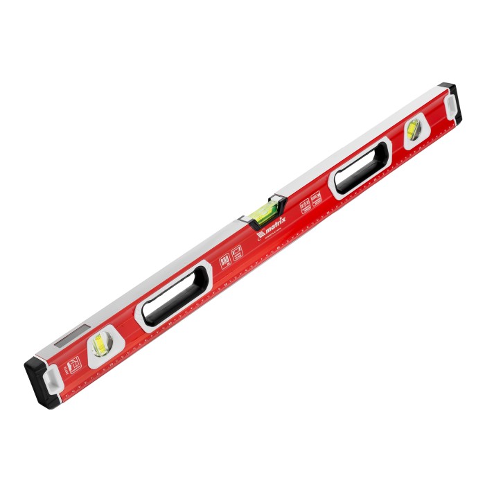 Уровень алюминиевый фрезерованный Matrix 34732 длиной 800 мм, с магнитной полосой и 2-компонентными рукоятками, 3 глазками и 1 зеркальным отражателем, — измерительный инструмент для контроля отклонений поверхностей от горизонтали, вертикали и угла 45°. Используется для выполнения работ, требующих высокой точности.ПреимуществаПрочность и долговечность — корпус изготовлен из алюминиевого профиля, устойчивого к образованию коррозии.Высокая точность проводимых работ — электронная калибровка глазков уровня и фрезеровка рабочей грани позволили снизить погрешность измерений до 0,5 мм/м.Продуманная конструкция — в корпусе имеются рукоятки для удобного захвата инструмента и 2 отверстия для организации подвесного хранения.Дополнительные возможности — измерительная шкала на корпусе позволяет использовать уровень в качестве линейки.Для определения отклонения от вертикали 90° необходимо использовать пузырьковую ампулу только в верхнем положении уровня. Только базовая поверхность (противоположная ампуле 180°) является рабочей.