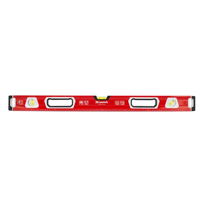 Уровень алюминиевый фрезерованный Matrix 34732 длиной 800 мм, с магнитной полосой и 2-компонентными рукоятками, 3 глазками и 1 зеркальным отражателем, — измерительный инструмент для контроля отклонений поверхностей от го...