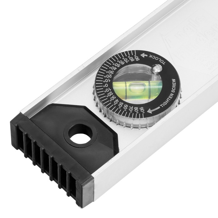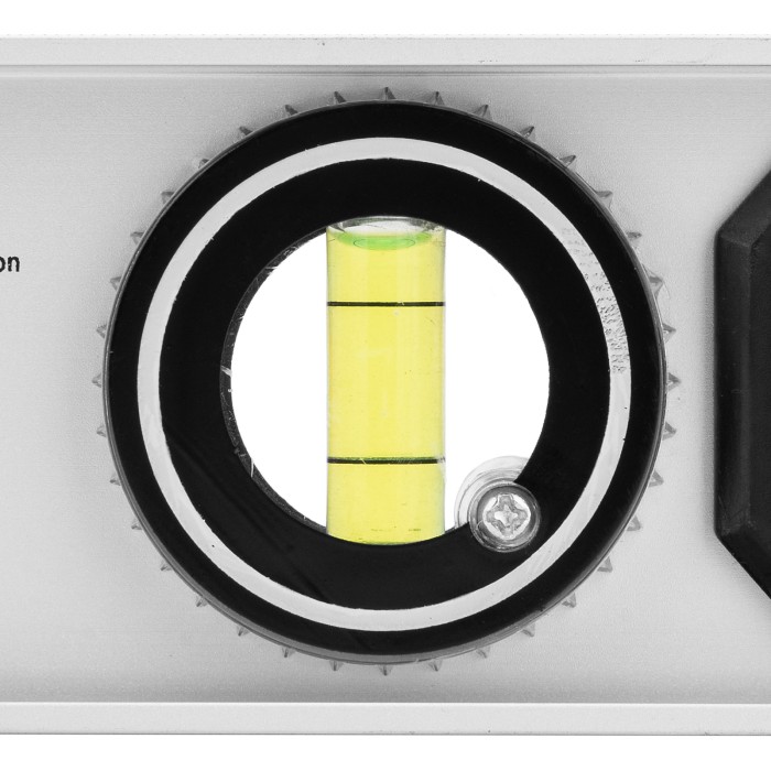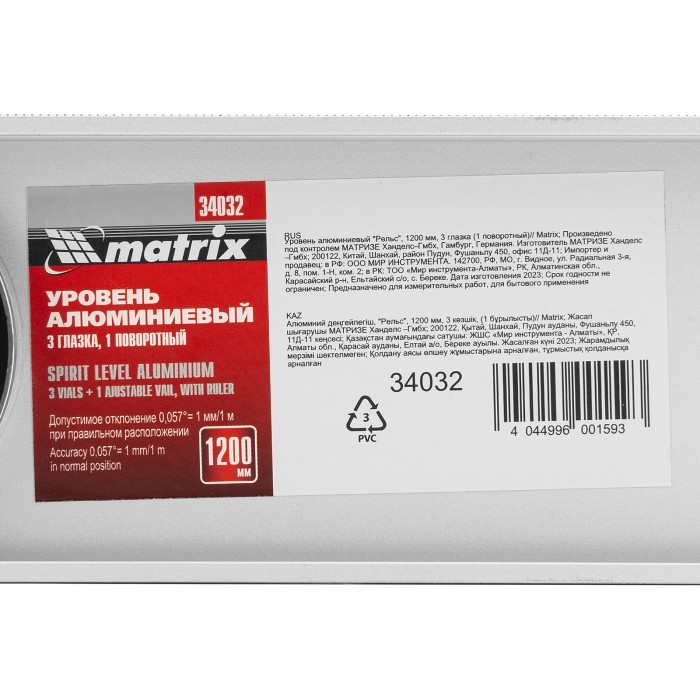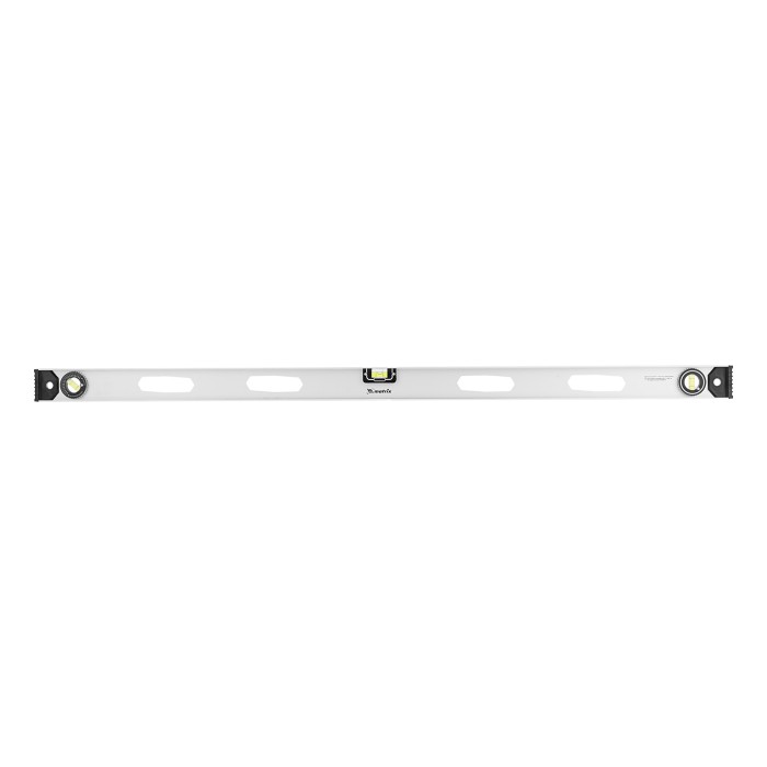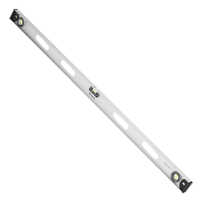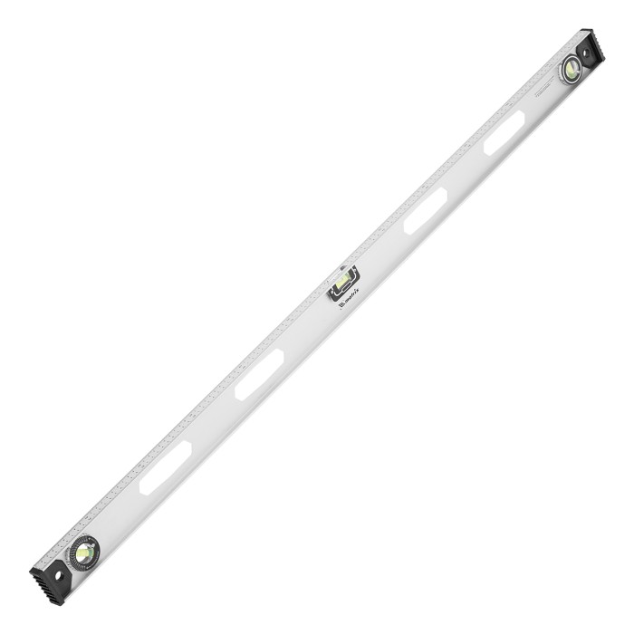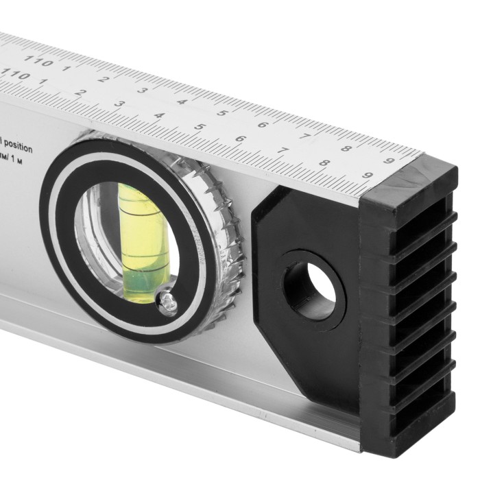 Алюминиевый уровень Matrix «Рельс» 34032 длиной 1200 мм имеет 3 глазка: 2 для проверки отклонений от заданной вертикали и горизонтали и 1 поворотный для проверки наклонных поверхностей.ПреимуществаТочные результаты — погрешность измерений составляет всего 1 мм на метр (0,057°).Защита корпуса — пластиковые заглушки по бокам повышают ударопрочность и предотвращают попадание мусора.Дополнительные возможности — шкала на корпусе позволяет измерить длину или ширину предметов.Для определения отклонения вертикали 90° необходимо использовать пузырьковую ампулу только в верхнем положении уровня. Только базовая поверхность (противоположная ампуле 180°) является рабочей.
