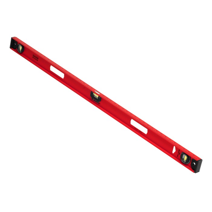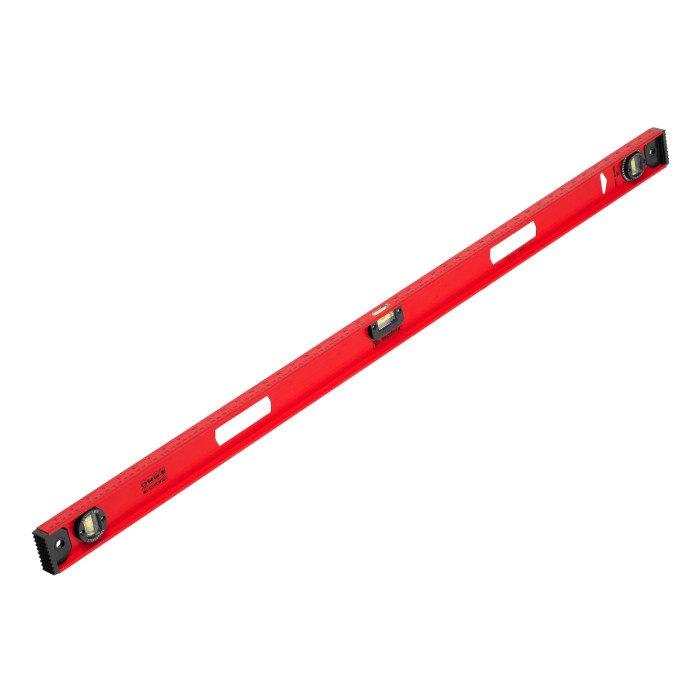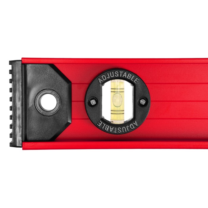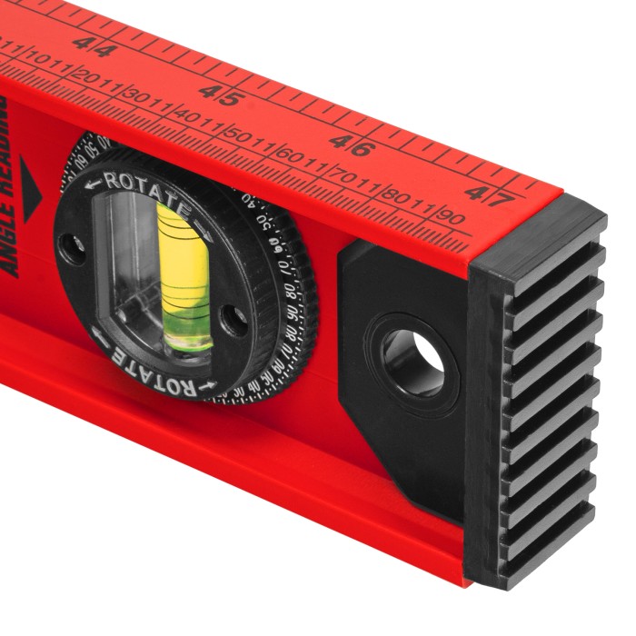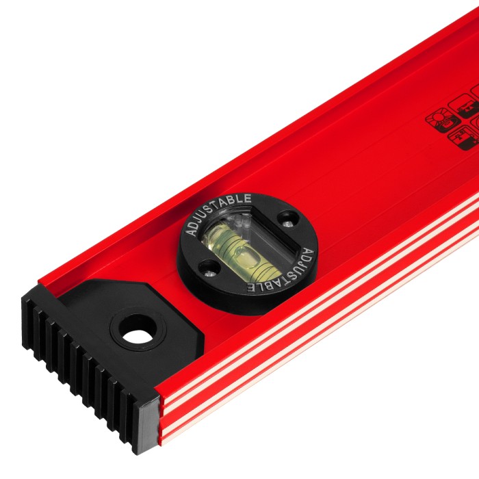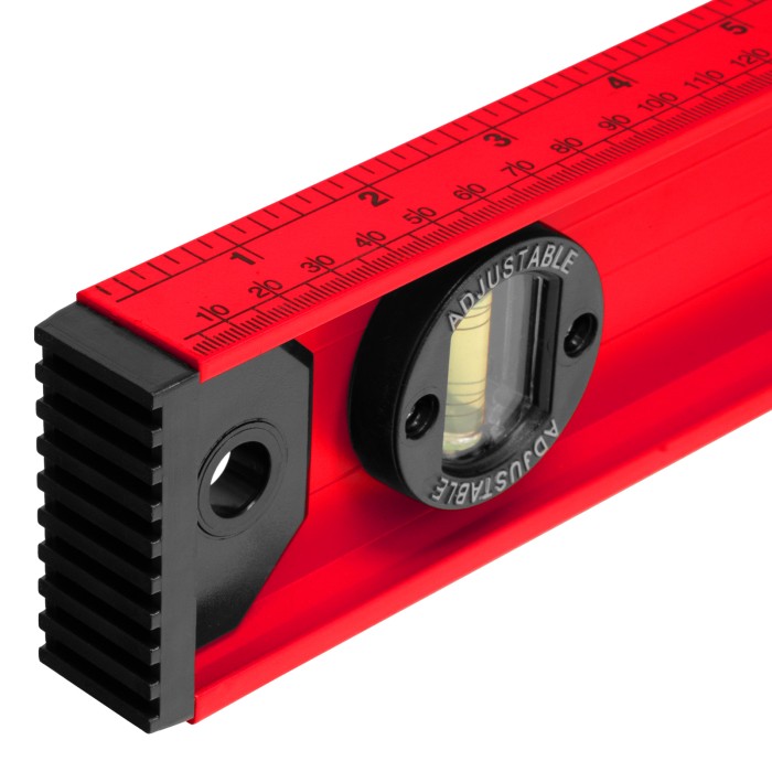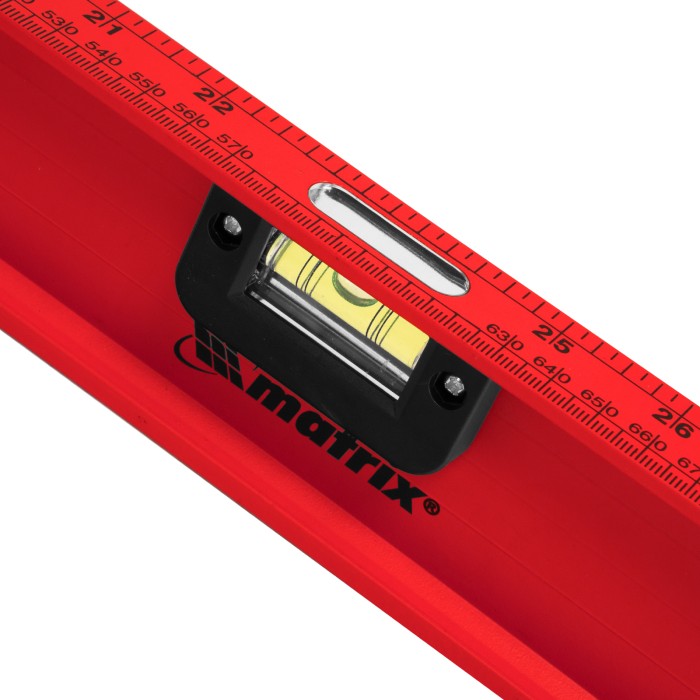 Уровень алюминиевый усиленный Matrix «Рельс» 34012 длиной 1200 мм снабжен 3 глазками для проверки отклонений относительно горизонтальной и вертикальной плоскостей. Поворотный глазок уровня позволяет выстроить произвольный угол. Инструмент пригодится строителю, отделочнику, бетонщику и другим специалистам.ПреимуществаКонструкционная прочность — инструмент из двутаврового алюминиевого профиля устойчив к механическим воздействиям.Удобное проведение сантехнических работ — подошва V-образной формы позволяет закрепить уровень на трубе.Высокая точность — инструмент имеет фрезерованную подошву, погрешность составляет 1 мм/м (0,057°).Для определения отклонения вертикали 90° необходимо использовать пузырьковую ампулу только в верхнем положении уровня. Только базовая поверхность (противоположная ампуле 180°) является рабочей.