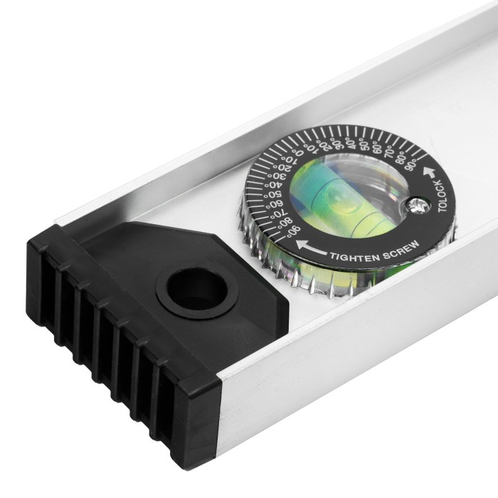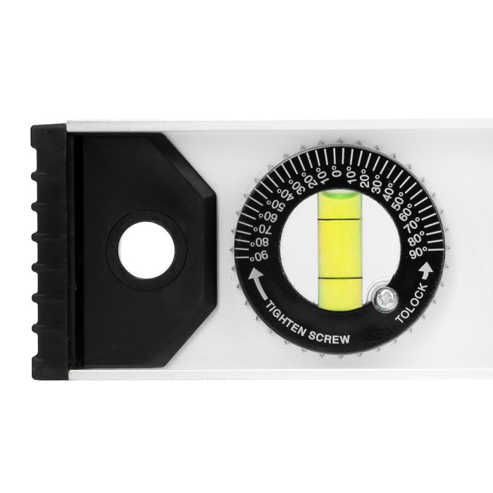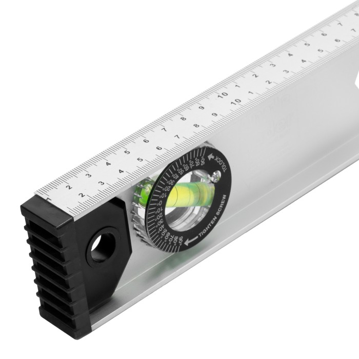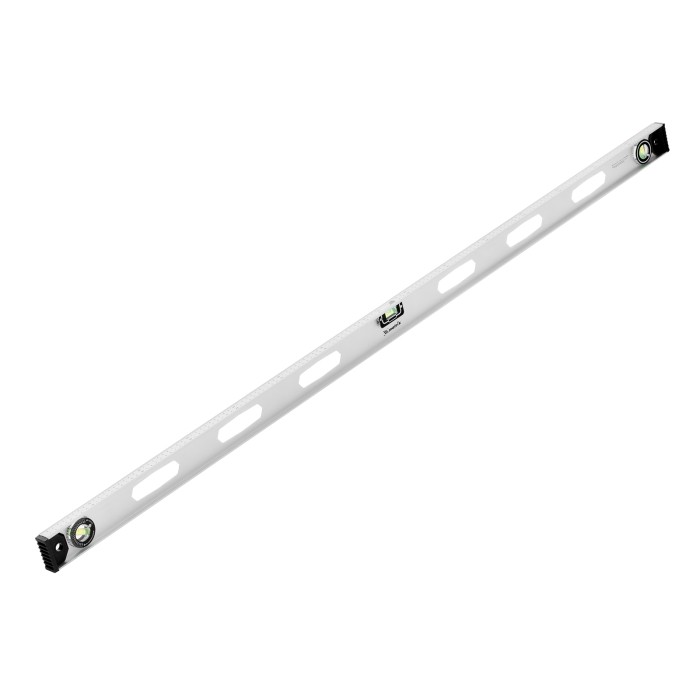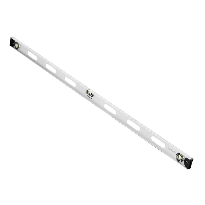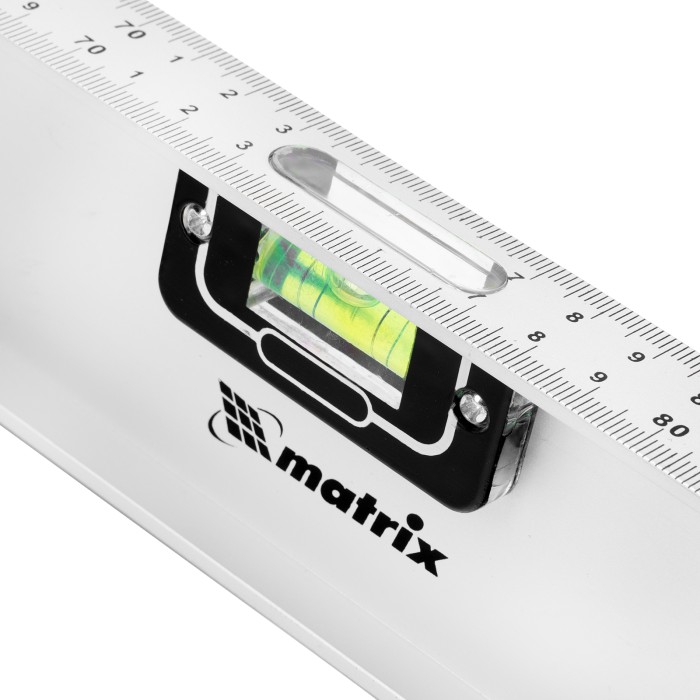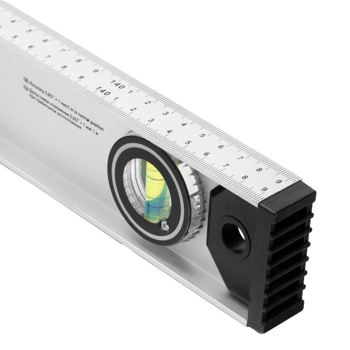 Алюминиевый уровень Matrix «Рельс» 34035 длиной 1500 мм имеет 3 глазка: 2 для проверки отклонений от заданной вертикали и горизонтали и 1 поворотный для проверки наклонных поверхностей.ПреимуществаТочные результаты — погрешность измерений составляет всего 1 мм на метр (0,057°).Защита корпуса — пластиковые заглушки по бокам повышают ударопрочность и предотвращают попадание мусора.Дополнительные возможности — шкала на корпусе позволяет измерить длину или ширину предметов.Для определения отклонения вертикали 90° необходимо использовать пузырьковую ампулу только в верхнем положении уровня. Только базовая поверхность (противоположная ампуле 180°) является рабочей.