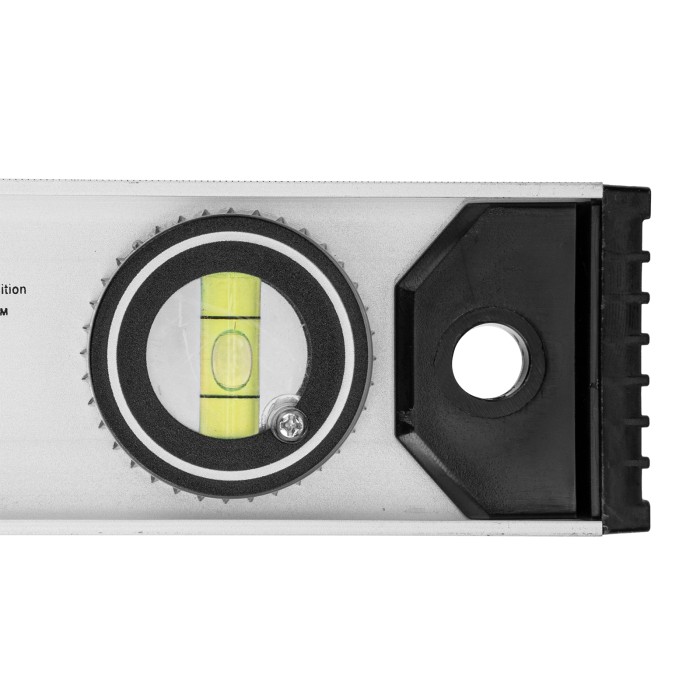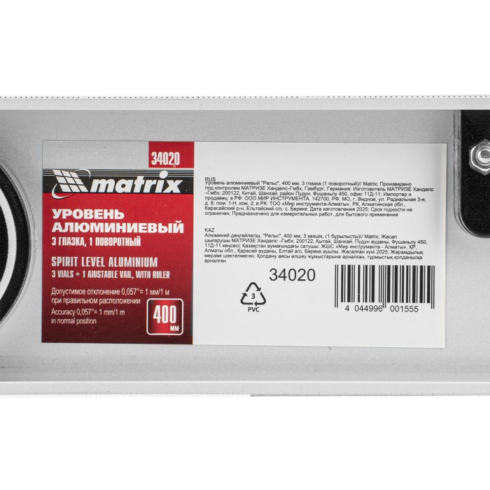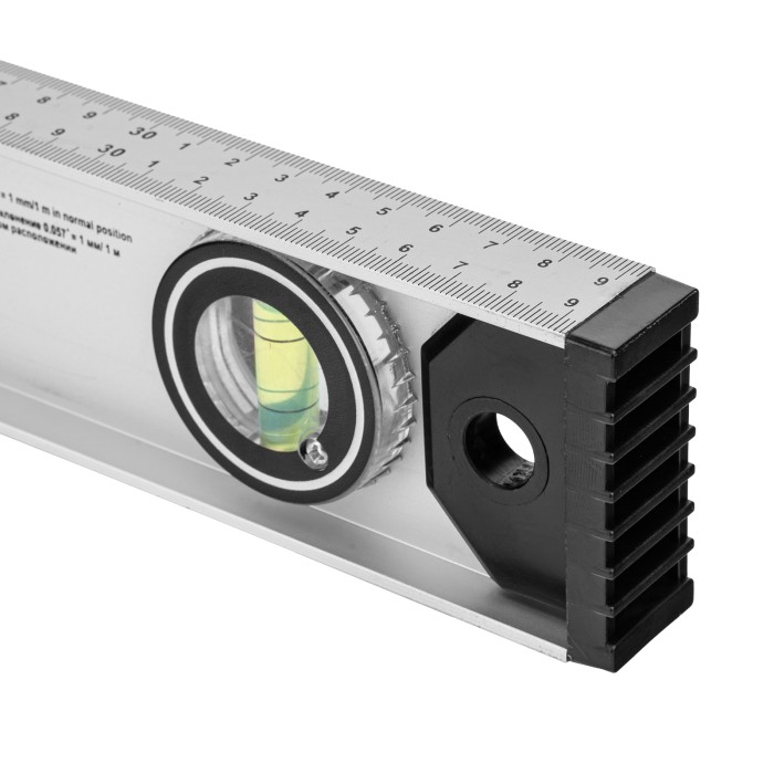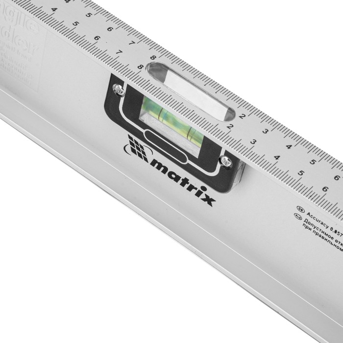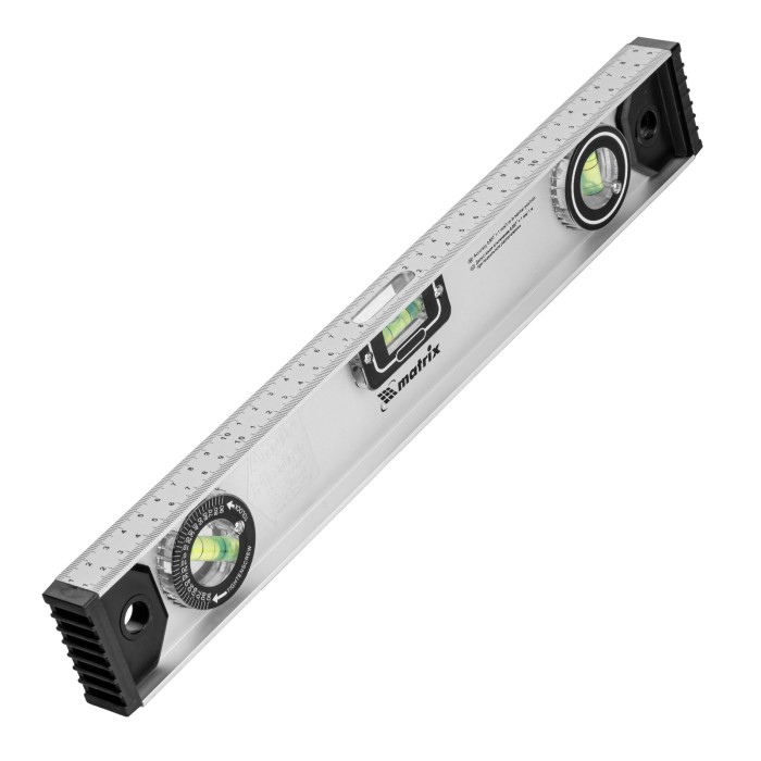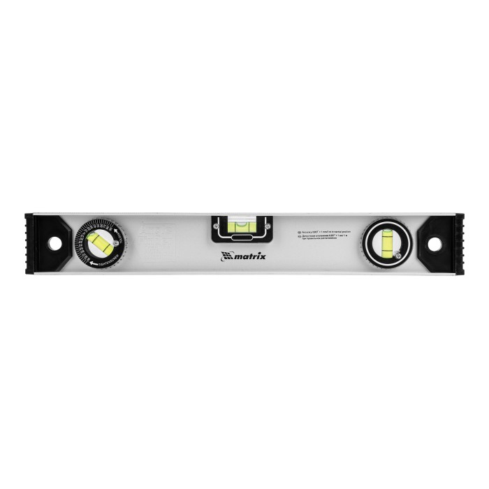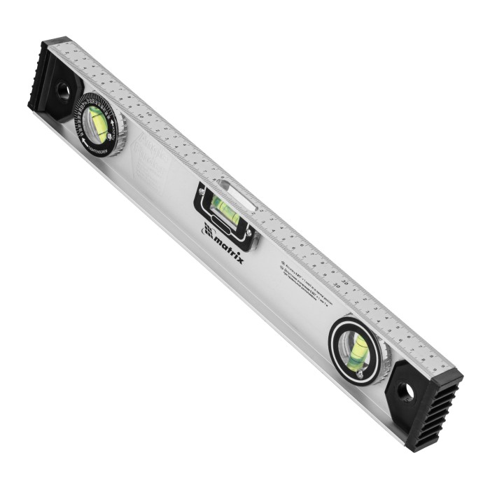 Алюминиевый уровень Matrix «Рельс» 34020 длиной 400 мм имеет 3 глазка: 2 для проверки отклонений от заданной вертикали и горизонтали и 1 поворотный для проверки наклонных поверхностей.ПреимуществаТочные результаты — погрешность измерений составляет всего 1 мм на метр (0,057°).Защита корпуса — пластиковые заглушки по бокам повышают ударопрочность и предотвращают попадание мусора.Дополнительные возможности — шкала на корпусе позволяет измерить длину или ширину предметов.Для определения отклонения вертикали 90° необходимо использовать пузырьковую ампулу только в верхнем положении уровня. Только базовая поверхность (противоположная ампуле 180°) является рабочей.