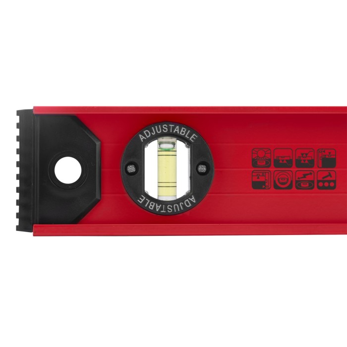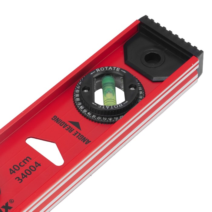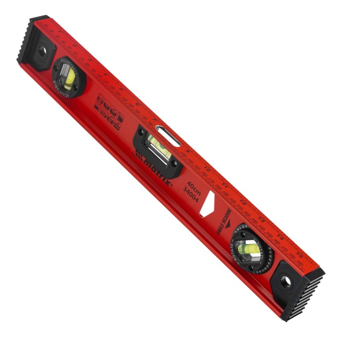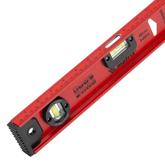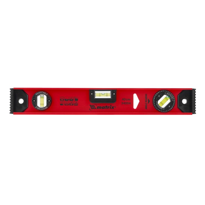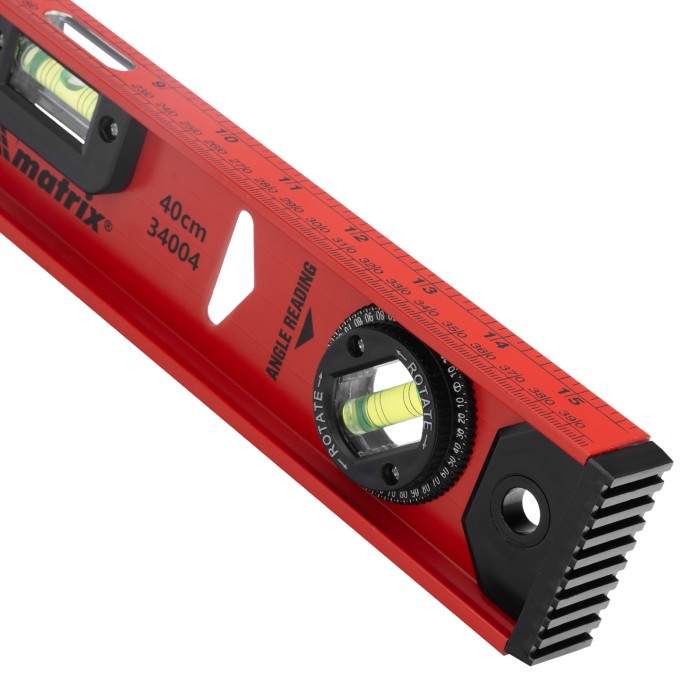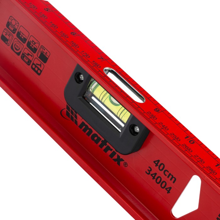 Уровень алюминиевый усиленный Matrix «Рельс» 34004 длиной 400 мм снабжен 3 глазками для проверки отклонений относительно горизонтальной и вертикальной плоскостей. Поворотный глазок уровня позволяет выстроить произвольный угол. Инструмент пригодится строителю, отделочнику, бетонщику и другим специалистам.ПреимуществаКонструкционная прочность — инструмент из двутаврового алюминиевого профиля устойчив к механическим воздействиям.Удобное проведение сантехнических работ — подошва V-образной формы позволяет закрепить уровень на трубе.Высокая точность — инструмент имеет фрезерованную подошву, погрешность составляет 1 мм/м (0,057°).Для определения отклонения вертикали 90° необходимо использовать пузырьковую ампулу только в верхнем положении уровня. Только базовая поверхность (противоположная ампуле 180°) является рабочей.