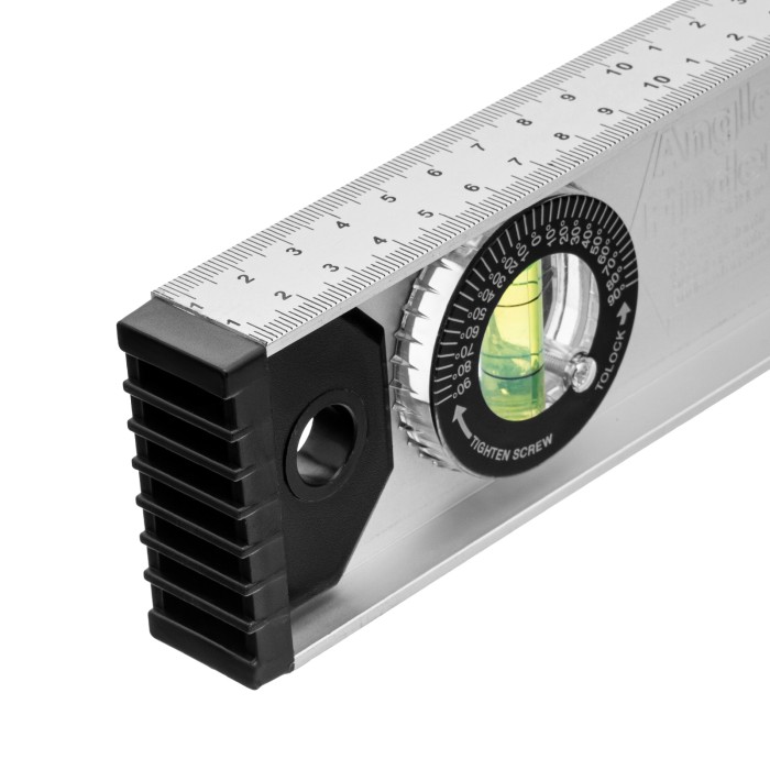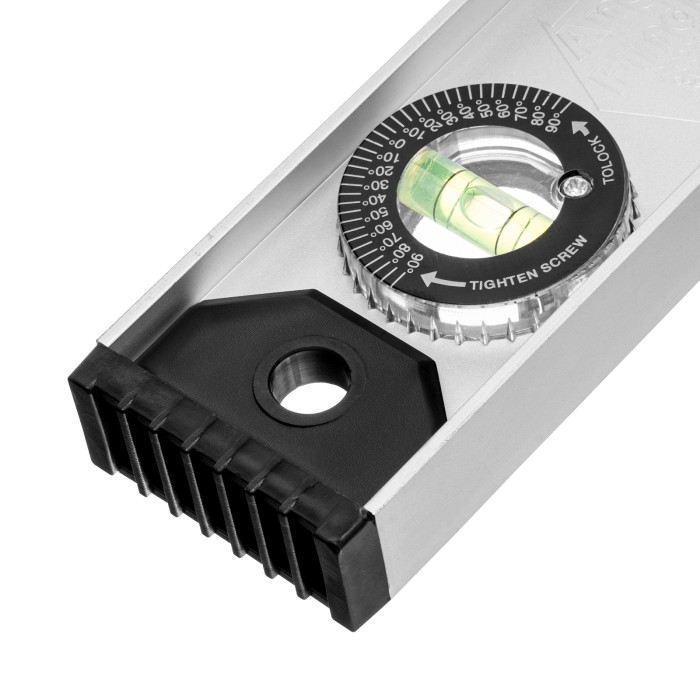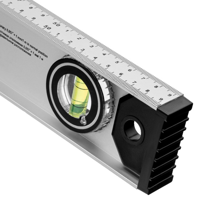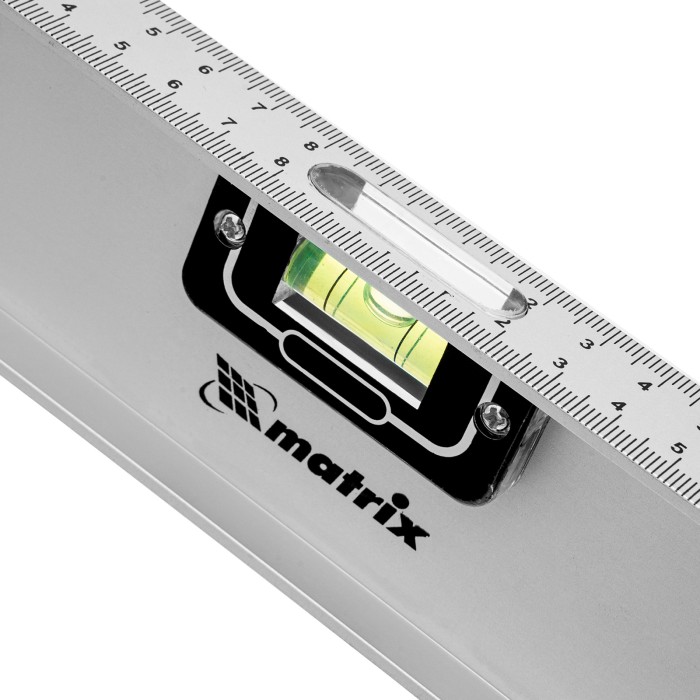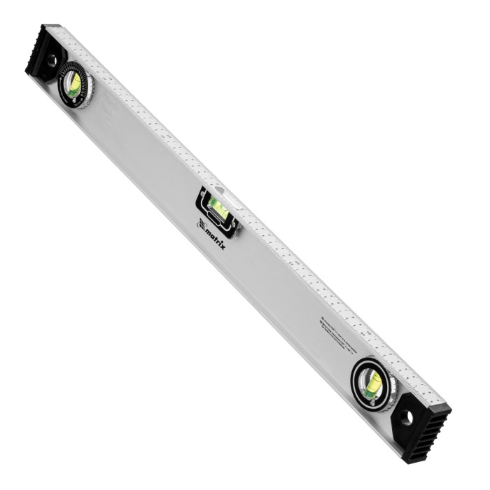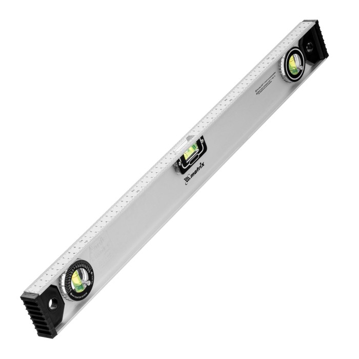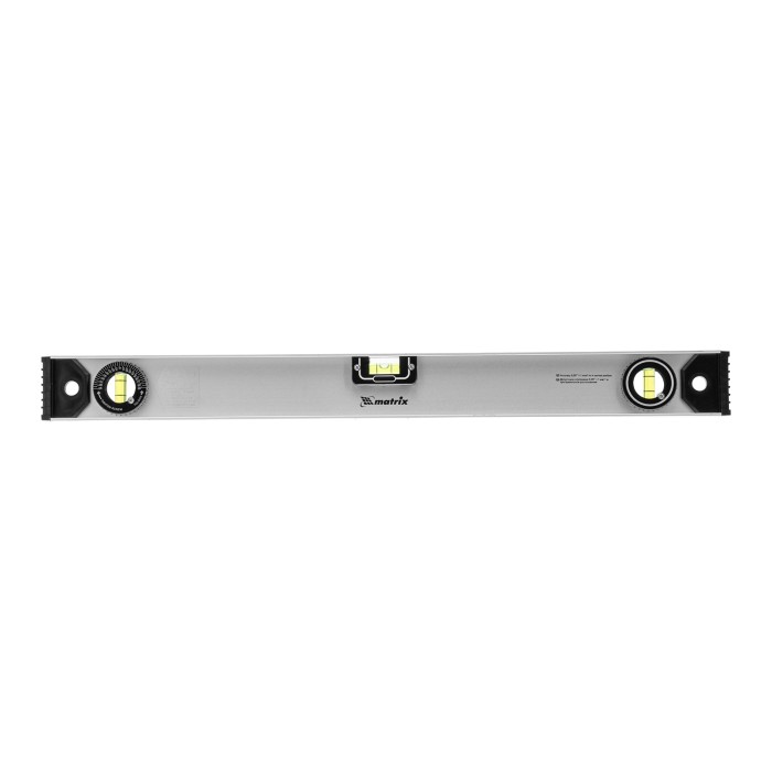 Алюминиевый уровень Matrix «Рельс» 34023 длиной 600 мм имеет 3 глазка: 2 для проверки отклонений от заданной вертикали и горизонтали и 1 поворотный для проверки наклонных поверхностей.ПреимуществаТочные результаты — погрешность измерений составляет всего 1 мм на метр (0,057°).Защита корпуса — пластиковые заглушки по бокам повышают ударопрочность и предотвращают попадание мусора.Дополнительные возможности — шкала на корпусе позволяет измерить длину или ширину предметов.Для определения отклонения вертикали 90° необходимо использовать пузырьковую ампулу только в верхнем положении уровня. Только базовая поверхность (противоположная ампуле 180°) является рабочей.