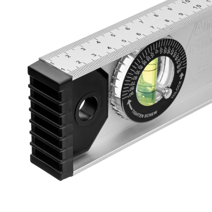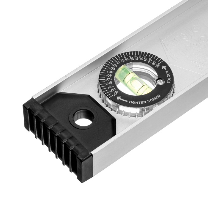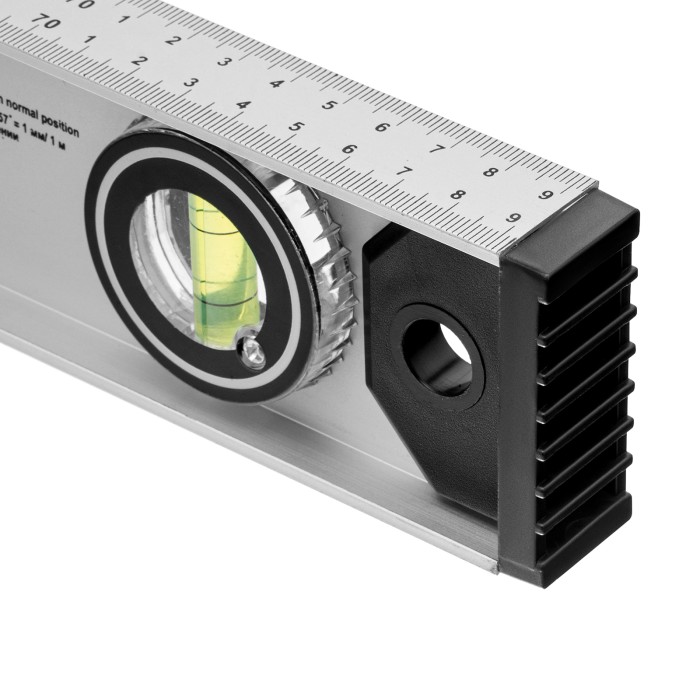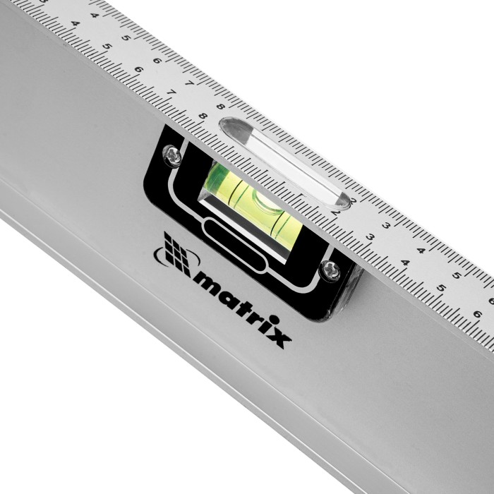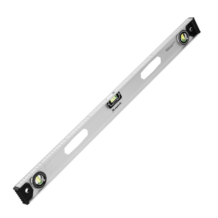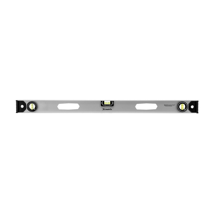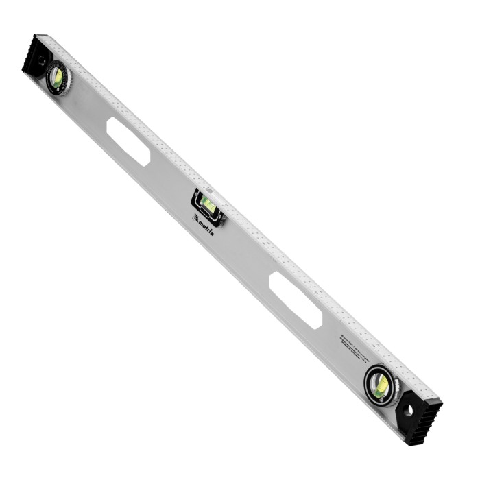 Алюминиевый уровень Matrix «Рельс» 34026 длиной 800 мм имеет 3 глазка: 2 для проверки отклонений от заданной вертикали и горизонтали и 1 поворотный для проверки наклонных поверхностей.ПреимуществаТочные результаты — погрешность измерений составляет всего 1 мм на метр (0,057°).Защита корпуса — пластиковые заглушки по бокам повышают ударопрочность и предотвращают попадание мусора.Дополнительные возможности — шкала на корпусе позволяет измерить длину или ширину предметов.Для определения отклонения вертикали 90° необходимо использовать пузырьковую ампулу только в верхнем положении уровня. Только базовая поверхность (противоположная ампуле 180°) является рабочей.