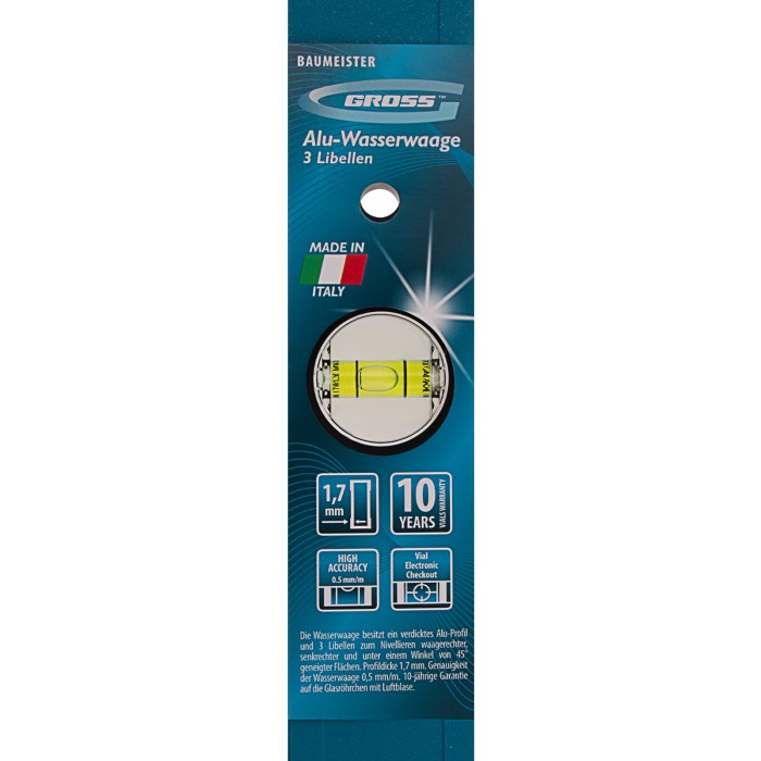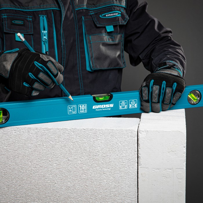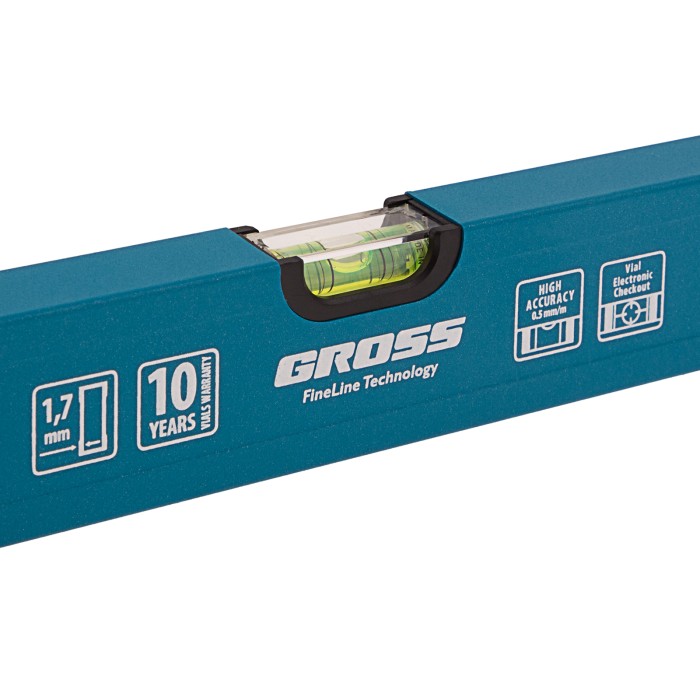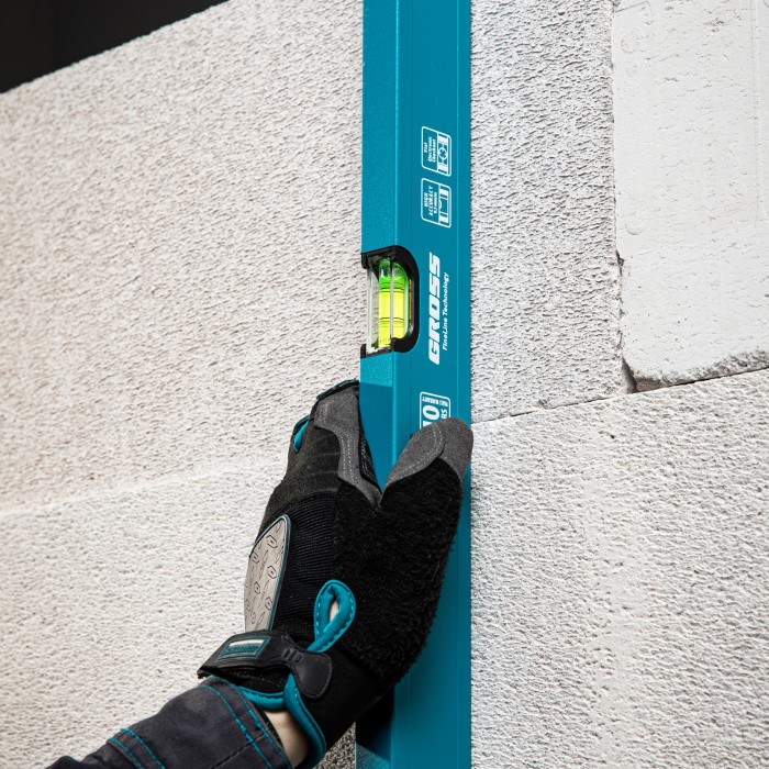 Усиленный алюминиевый уровень Gross 33628 длиной 800 мм, с 3 глазками, поможет найти отклонения от горизонтали и вертикали для повышения точности работы. Этот простой, но незаменимый для любого мастера инструмент пригодится на стройке, при проведении ремонтных и монтажных работ. Уровень с глазком на 45° позволяет измерить угол наклона, поэтому также пригодится при кровельных работах, проверке откосов и различных наклонных поверхностей.ПреимуществаПротивоударная конструкция — колбы из полистирола обладают высокой стойкостью к механическим воздействиям, поэтому инструмент выдерживает падения с небольшой высоты.Защитное порошковое покрытие — инструмент устойчив к воздействию агрессивных сред.Качественное исполнение — уровень изготовлен в Италии на высокотехнологичном производстве, погрешность измерений составляет всего 0,5 мм/м.Для определения отклонения вертикали 90° необходимо использовать пузырьковую ампулу только в верхнем положении уровня. Только базовая поверхность является рабочей (противоположная ампуле 180°).