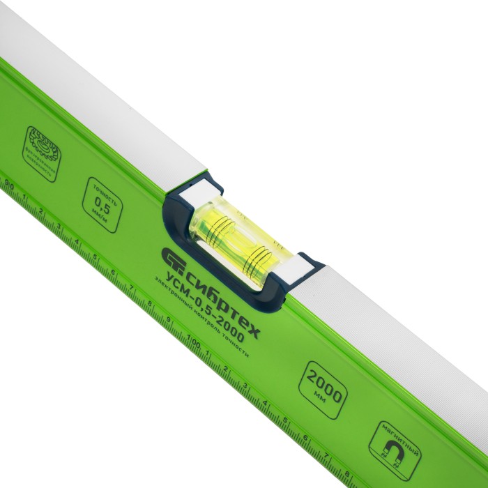 Уровень алюминиевый магнитный Сибртех УСМ-0,5-2000 34121 длиной 2000 мм, фрезерованный, с рукоятками и 3 глазками, позволяет оценить ровность поверхностей и определить отклонения относительно горизонтали, вертикали и угла 45°. Будет полезен на строительной площадке, а также для выполнения работ по облицовке и отделке помещений, для монтажа конструкций.ПреимуществаВысокие прочностные характеристики — инструмент изготовлен из легкого алюминиевого профиля.Фиксация на металлических поверхностях — встроенные магниты позволяют освободить руки во время работы.Точные результаты — пузырьковые ампулы установлены при помощи электронного контроля, рабочая поверхность фрезерована, поэтому погрешность не превышает 0,5 мм/м.Комфортная работа — отверстия с подпальцевыми упорами обеспечивают надежный хват.Дополнительные возможности — измерительная шкала позволяет определять размеры предметов.Для определения отклонения вертикали 90° необходимо использовать пузырьковую ампулу только в верхнем положении уровня. Только базовая поверхность (противоположная ампуле 180°) является рабочей.