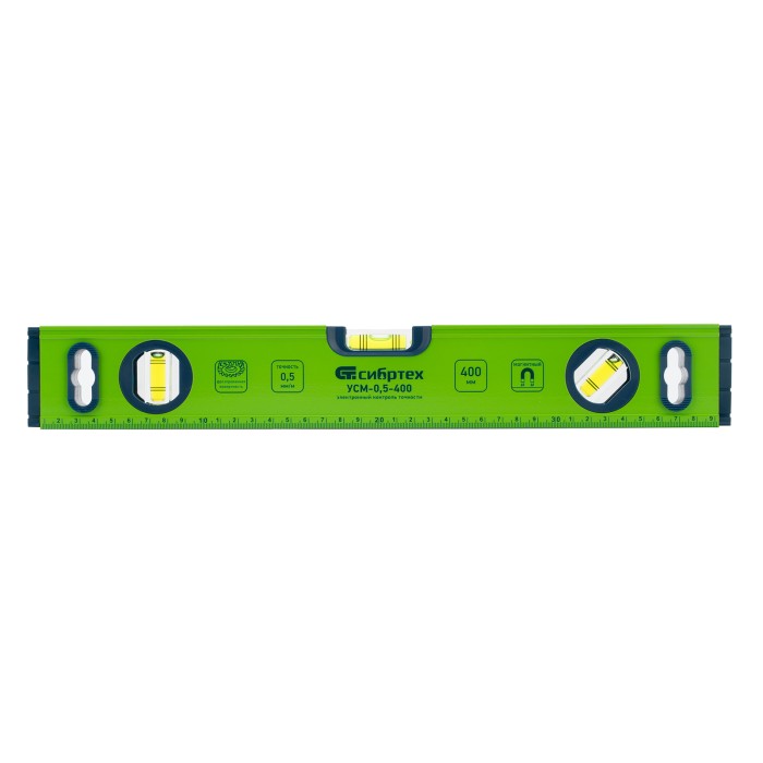 Алюминиевый фрезерованный уровень Сибртех УСМ-0,5-400 34113 длиной 400 мм, магнитный, с 3 глазками, поможет найти отклонения от горизонтальной и вертикальной плоскостей и угла 45 градусов. Инструмент незаменим при осуществлении строительных и ремонтных работ, т.к. обеспечивает высокую точность работы.,Для определения отклонения вертикали 90 градусов необходимо использовать пузырьковую ампулу только в верхнем положении уровня. Только базовая поверхность является рабочей (противоположная ампуле 180 градусов).ПреимуществаАлюминиевый профиль — инструмент отличается прочностью и малым весом 293 г.Надежность — контроль установки глазков уровня осуществлен электроникой.Высокая точность — рабочая поверхность инструмента фрезерована, погрешность не превышает 0,5 мм/м.Удобство работы — уровень имеет измерительную шкалу на корпусе.Встроенные магниты — прибор можно зафиксировать на металлических поверхностях и освободить руки.Защита от попадания мусора — с обеих сторон на корпусе имеются заглушки.