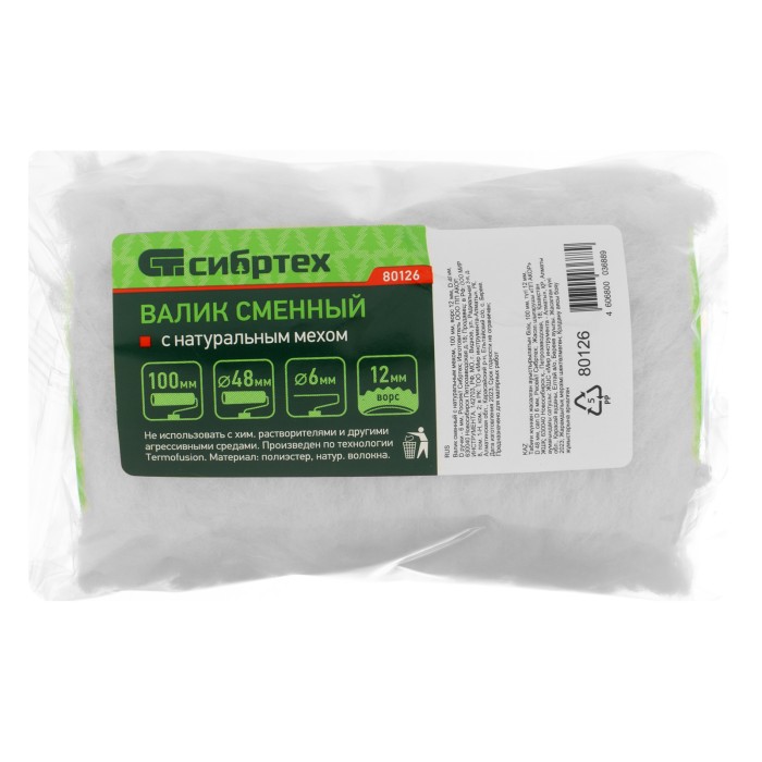 Сменный валик с натуральным мехом Сибртех 80126 100 х 48 мм, под ручку 6 мм, с ворсом 12 мм, предназначен для малярных работ. Применяется для нанесения эмалевых, масляных, водно-дисперсионных красок и защитных покрытий. Длина ворса 12 мм делает валик универсальным и позволяет применять его на большинстве поверхностей. Валик подходит к модели Сибртех 80121 и другим изделиям с соответствующим размером рукоятки.ПреимуществаНадежная конструкция — фланцы валика приварены ультразвуком, поэтому он выдерживает частую установку и снятие с бюгеля.Долговечность — валик произведен по технологии Termofusion с термоклеевой фиксацией шубки, что позволяет использовать его многократно без риска деформации.Качественное исполнение — ролик свободно вращается и не заедает, обеспечивая максимальный коэффициент отдачи краски.Ширина 100 мм — валиком удобно работать в труднодоступных местах.