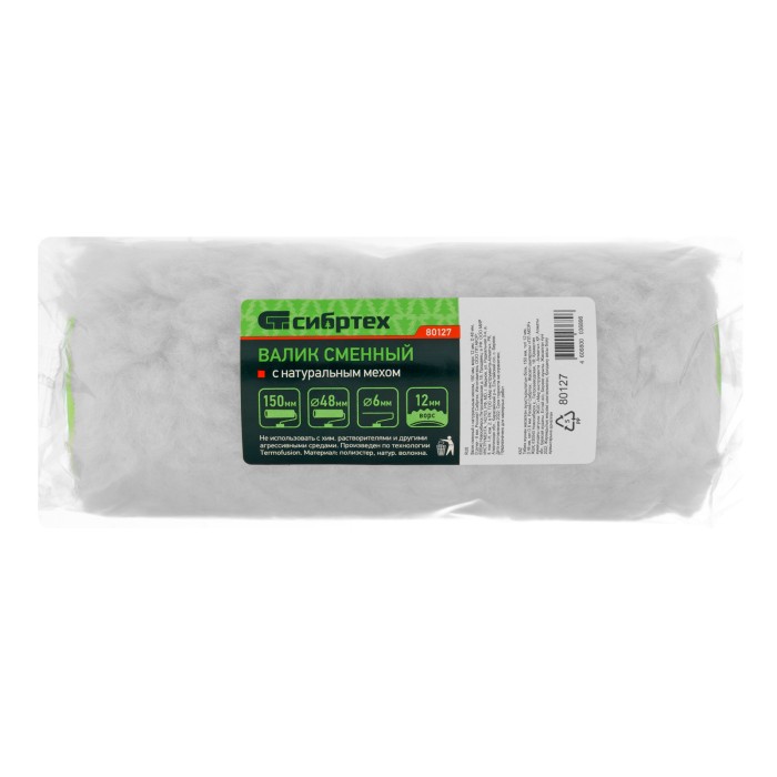 Сменный валик с натуральным мехом Сибртех 80127 шириной 150 мм и диаметром 48 мм, под ручку 6 мм, с ворсом 12 мм, предназначен для малярных работ. Применяется для нанесения эмалевых, масляных, водно-дисперсионных красок и защитных покрытий. Длина ворса 12 мм делает валик универсальным и позволяет применять его на большинстве поверхностей. Валик подходит к модели Сибртех 80122 и другим изделиям с соответствующим размером рукоятки.ПреимуществаНадежная конструкция — фланцы валика приварены ультразвуком, поэтому он выдерживает частую установку и снятие с бюгеля.Долговечность — валик произведен по технологии Termofusion с термоклеевой фиксацией шубки, что позволяет использовать его многократно без риска деформации.Качественное исполнение — ролик свободно вращается и не заедает, обеспечивая максимальный коэффициент отдачи краски.Ширина 150 мм — валиком удобно работать в труднодоступных местах.