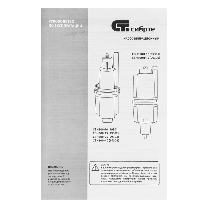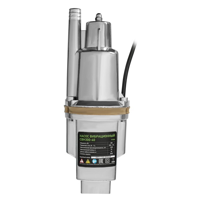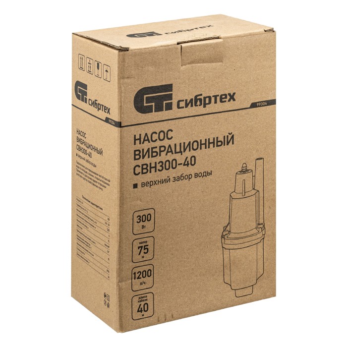 Вибрационный насос Сибртех СВН300-40 99304, имеющий мощность 300 Вт и производительность до 1200 л/ч, с верхним забором жидкости и кабелем длиной 40 м, легко справляется с перекачкой чистой воды из водоемов, колодцев, резервуаров и затопленных помещений, обеспечивая напор до 75 м. Оптимален для подачи воды в системы полива и водоснабжения на даче, в том числе в доме высотой в 2-3 этажа.ПреимуществаБыстрый монтаж — необходимо закрепить трос на проушинах, опустить насос в колодец и зафиксировать на глубине до 5 м.Прочность — алюминиевый корпус защищает внутренние компоненты от механических повреждений.Надежность — благодаря системе верхнего забора жидкости снижается риск перегрева, т.к. корпус постоянно находится в воде.Высокое качество сборки — корпус закреплен с помощью болтов, что повышает надежность соединений даже при сильных вибрациях.Влагозащита — корпус полностью герметичен, поэтому вода не проникает к электронным компонентам.Возможность подачи питьевой воды — мембрана выполнена из пищевой резины, безвредной для здоровья.Длинный кабель — 40-метровый сетевой шнур позволяет подключать насос к удаленной розетке напрямую без удлинителя.Необходимые аксессуары в комплекте — трос для установки и хомут для подключения шланга прилагаются к насосу.Простая эксплуатация — насос вибрационного типа не нуждается в постоянном техническом обслуживании.Малый вес 5,2 кг — насос можно транспортировать и устанавливать в одиночку.