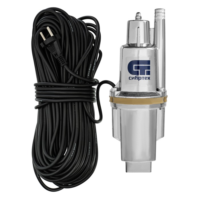 Вибрационный насос Сибртех СВН300-40 99304, имеющий мощность 300 Вт и производительность до 1200 л/ч, с верхним забором жидкости и кабелем длиной 40 м, легко справляется с перекачкой чистой воды из водоемов, колодцев, ре...