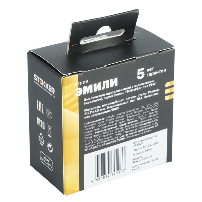 Выключатели одноклавишный STEKKER RSW10-5101-09, серия Эмили, с подсветкой (белый), тип установки - скрытый, размер изделия 71*71*40мм., цвет антрацит, soft touch, материал изделия поликарбонат, латунь, сталь. Номинальное напряжение 250 , номинальный ток 10А, 20