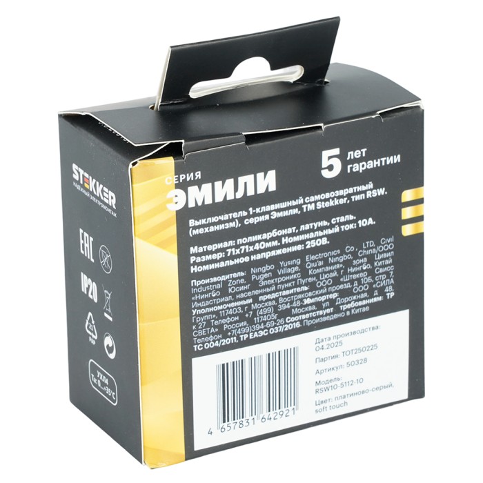 Выключатели одноклавишный STEKKER RSW10-5112-10, серия Эмили тип установки - скрытый, размер изделия 71*71*40мм., цвет платиново-серый, soft touch, материал изделия поликарбонат, латунь, сталь. Номинальное напряжение 250 , номинальный ток 10А, 20
