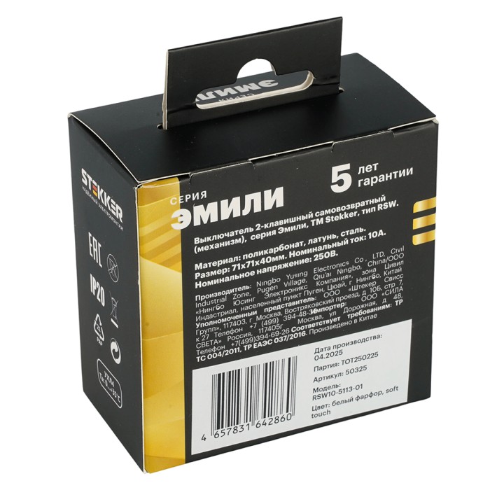 Выключатели двухклавишный STEKKER RSW10-5113-01, серия Эмили тип установки - скрытый, размер изделия 71*71*40мм., цвет белый фарфор, soft touch, материал изделия поликарбонат, латунь, сталь. Номинальное напряжение 250 , номинальный ток 10А, 20