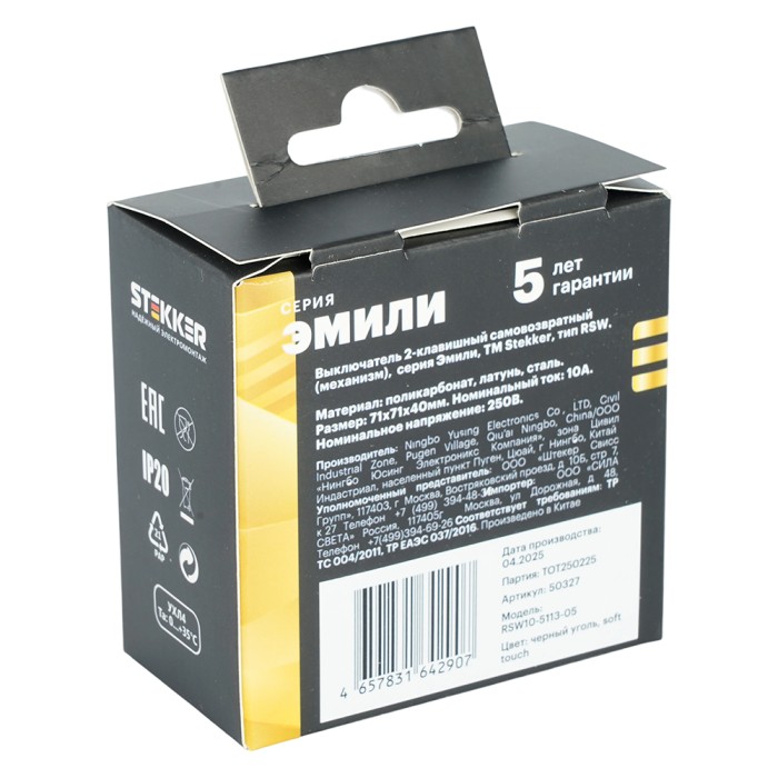 Выключатели двухклавишный STEKKER RSW10-5113-05, серия Эмили тип установки - скрытый, размер изделия 71*71*40мм., цвет черный уголь, soft touch, материал изделия поликарбонат, латунь, сталь. Номинальное напряжение 250 , номинальный ток 10А, 20