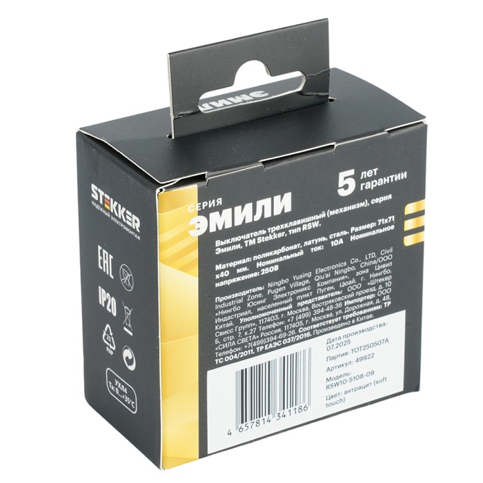 Выключатели трехклавишный STEKKER RSW10-5108-09, серия Эмили тип установки - скрытый, размер изделия 71*71*40мм., цвет антрацит, soft touch, материал изделия поликарбонат, латунь, сталь. Номинальное напряжение 250 , номи...