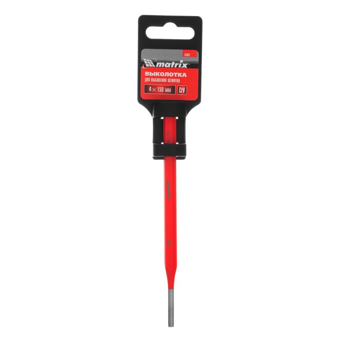 Выколотка Matrix 18302 из стали CrV, размером 4 х 150 мм, предназначена для выбивания штифтов, заглушек, заклепок, шпилек и других крепежных элементов. Используется в слесарном и столярном деле, а также для проведения ремонтных работ.ПреимуществаПрочность — выколотка из хромованадиевой стали выдерживает многократные ударные нагрузки.Высокий ресурс — рабочая часть дополнительно закалена до твердости 45-52 HRC, поэтому долго не изнашивается.Защита от разрушения — порошковое покрытие предотвращает образование коррозии.Продуманная шестигранная форма — выколотка не скатывается с наклонной поверхности и не выскальзывает из руки.Яркий красный цвет — инструмент не потеряется даже в условиях ограниченной видимости.
