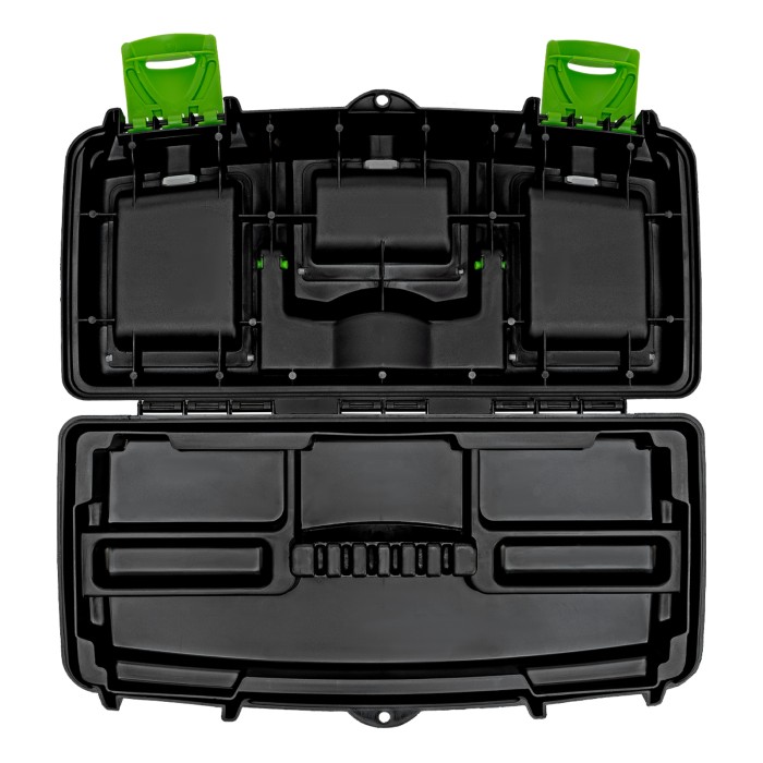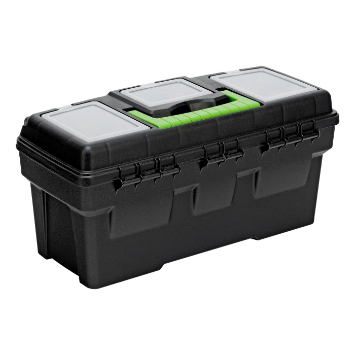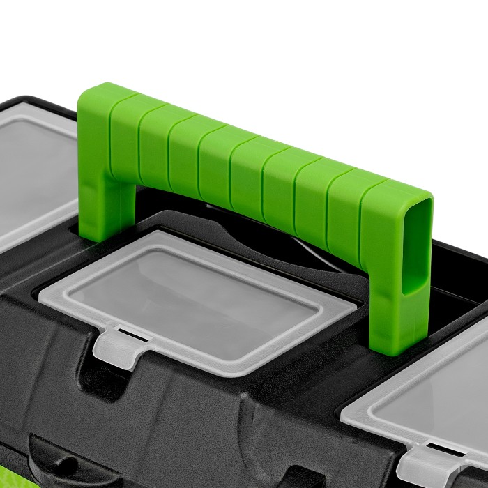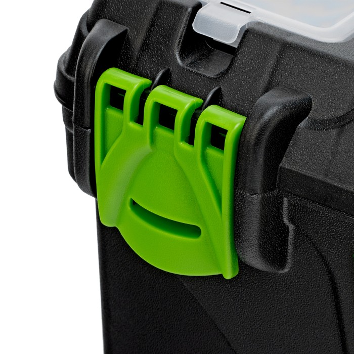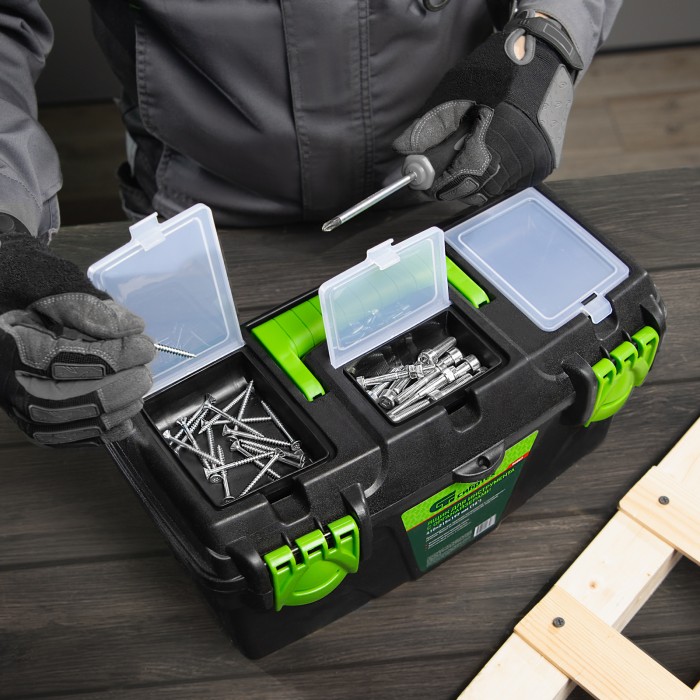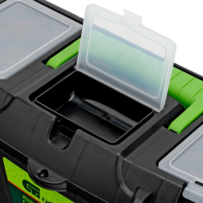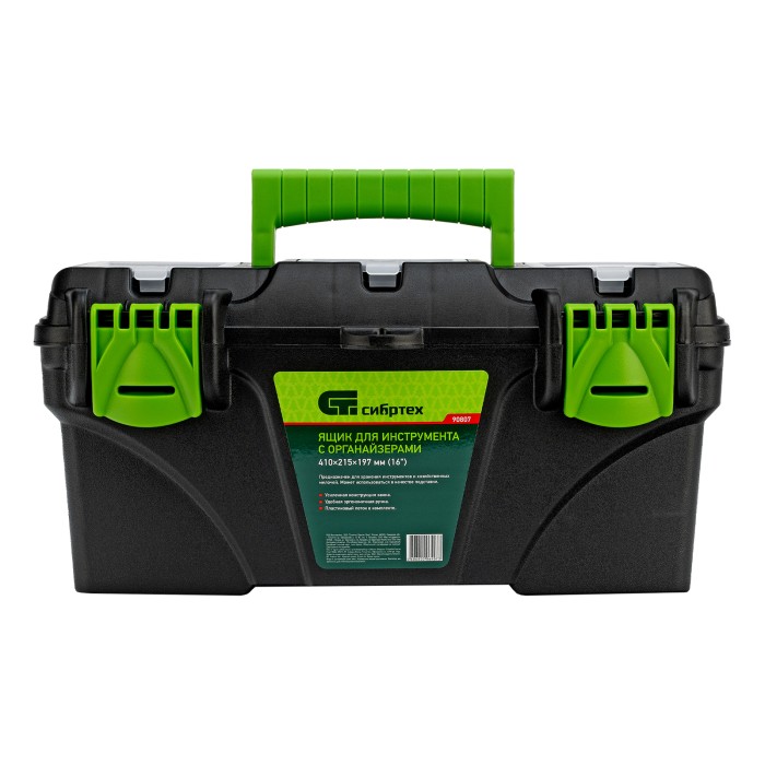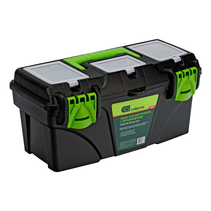 Ящик Сибртех 90807 длиной 16", с органайзерами, используется для хранения и транспортировки инструментов, оснастки, крепежа, хозяйственных мелочей и других предметов. Крышка и замок усилены трехрядными петлями, поэтому я...