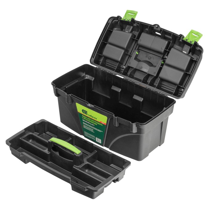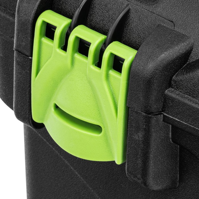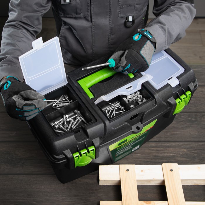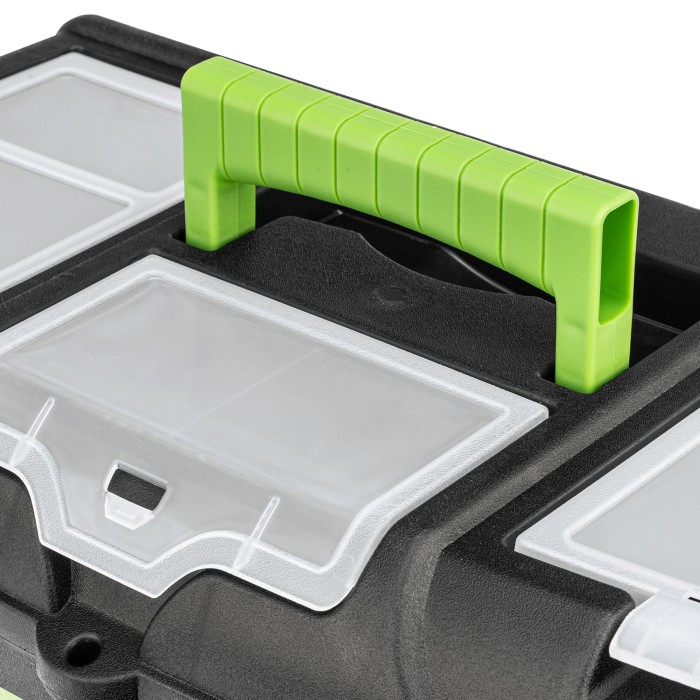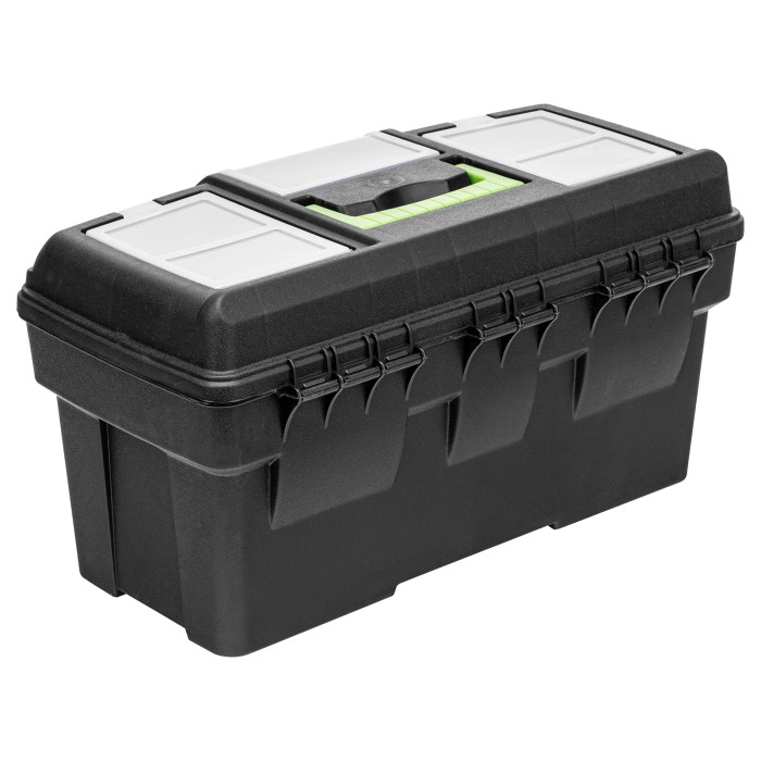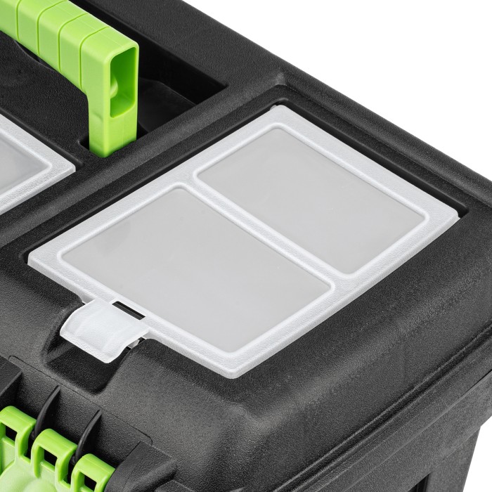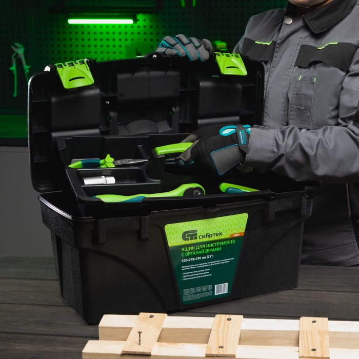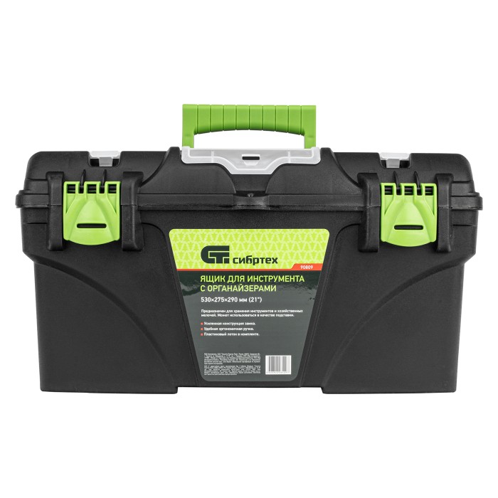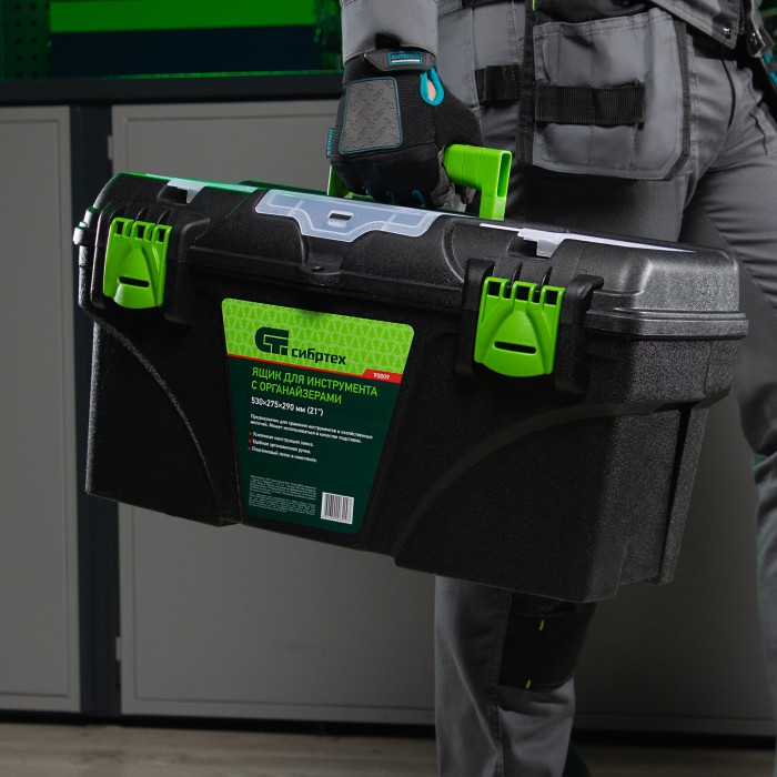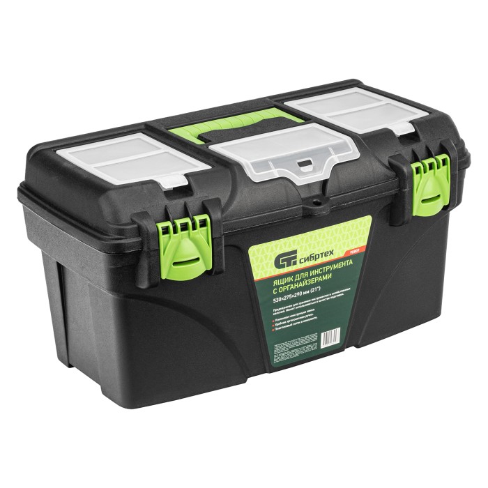 Ящик Сибртех 90809 длиной 21", с органайзерами, используется для хранения и транспортировки инструментов, оснастки, крепежа, хозяйственных мелочей и других предметов. Крышка и замок усилены трехрядными петлями, поэтому я...