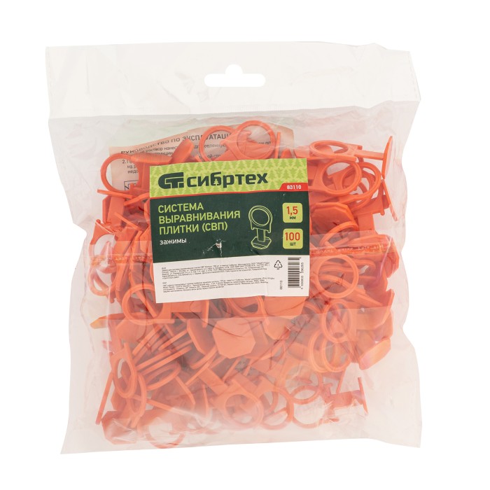 Система выравнивания плитки Сибртех СВП Кольцо 88110 состоит из зажимов (100 шт. в пакете), используемых совместно с клиньями. Позволяет добиться качественного результата: межплиточные швы получаются ровными и аккуратными, керамическая/керамогранитная плитка не смещается. Зажимы предназначены для формирования швов шириной 1,5 мм. Клинья приобретаются отдельно (артикулы 88050, 88071).ПреимуществаЭффективное выполнение большого объема работ — форма зажима "Кольцо" позволяет удобно фиксировать систему рукой.Простое использование — от пользователя не требуется опыт и специальные навыки.Быстрый демонтаж — после высыхания раствора зажим легко удалить, слегка ударив по нему киянкой.