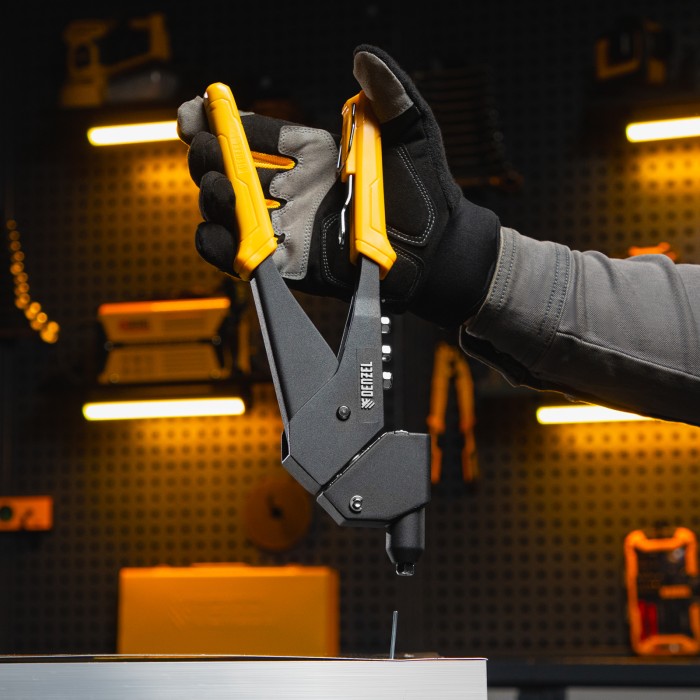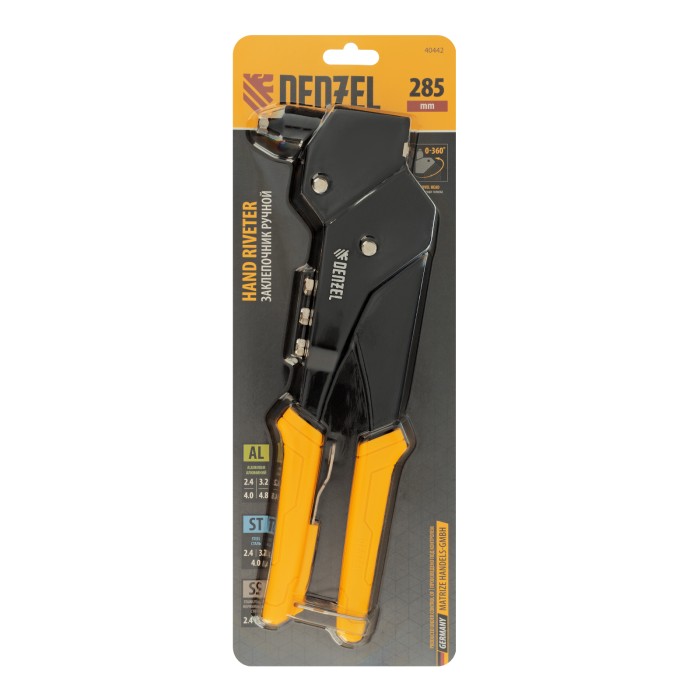 Заклепочник ручной литой Denzel 40442 длиной 285 мм, поворотный на 0-360°, используется для создания неразъемных соединений с помощью алюминиевых вытяжных заклепок диаметром 2,4-3,2-4,0-4,8 мм, стальных диаметром 2,4-3,2-4,0 мм и вытяжных заклепок из «нержавейки» диаметром 2,4-3,2 мм. Голова инструмента вращается на 360°, что упрощает работу в стесненных условиях. Заклепочник пригодится на производстве, в ремонтной мастерской, а также в быту.ПреимуществаПрочность и долговечность — корпус из алюминиевого сплава устойчив к механическим нагрузкам.Надежность — трехсегментный цанговый механизм из прочной стали 35Х крепко удерживает вытяжную шпильку заклепки.Безопасность — фиксатор рукоятки предотвращает случайное срабатывание инструмента во время транспортировки и позволяет сэкономить место для хранения.Готовность к работе — в комплект поставки включены сменные головки для заклепок разного размера и ключ для замены насадок.Продуманное хранение сменных насадок — головки крепятся на корпус, поэтому они всегда будут под рукой и не потеряются.Комфортная работа — эргономичные рукоятки с рельефной поверхностью надежно ложатся в руку.