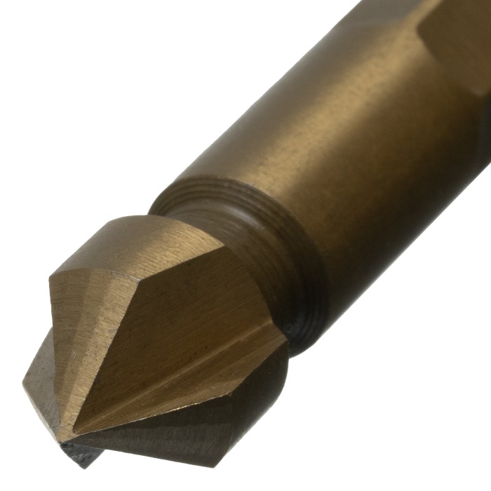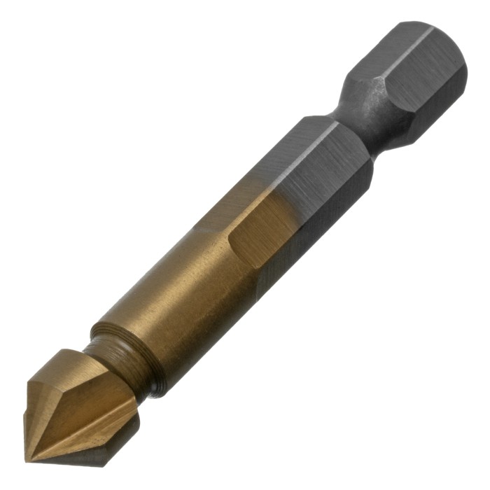 Конусная зенковка Denzel 72302 под болт M4, с 6-гранным хвостовиком, применяется для выполнения конических отверстий и снятия фасок в стали, цветных металлах, древесине и пластике. Устанавливается в патрон дрели или сверлильного станка. Три режущие кромки и идеальные углы заточки 90° обеспечивают точную и быструю обработку отверстий. Оснастка используется во время выполнения слесарных работ. ПреимуществаЭффективная работа — монолитная конструкция выполнена из быстрорежущей стали HSS.Износостойкость — рабочая часть твердостью 58-63 HRC долго сохраняет режущие свойства.Долговечность — нитридтитановое покрытие уменьшает трение и защищает оснастку от коррозии.Надежная фиксация — шестигранный хвостовик не проворачивается в патроне электроинструмента.