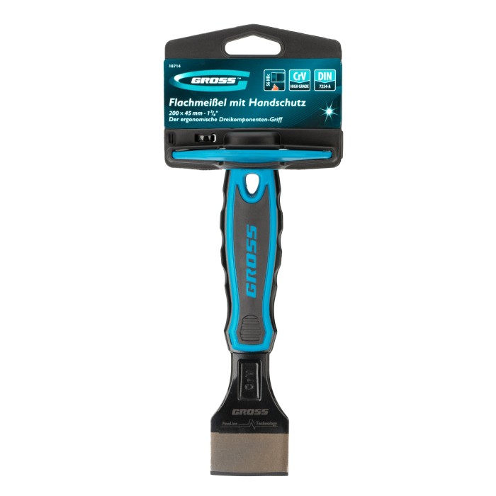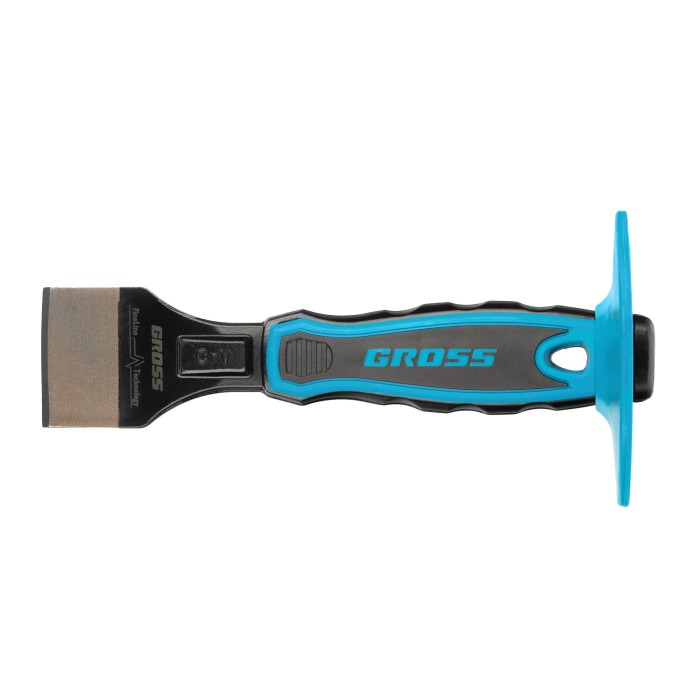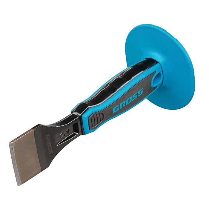 Зубило-конопатка Gross 18714 размером 200 х 45 мм-3/4 дюйма — ручной режущий инструмент, работающий под ударным воздействием молотка или киянки. Рассчитано на работу с деревянным срубом, плиткой, камнем, кирпичом. Используется для запечатывания швов, монтажа утеплителя в деревянных постройках, демонтажа облицовки и решения других задач. ПреимуществаПрочность и износостойкость — полотно изготовлено из хромованадиевой стали, а рабочая часть закалена до твердости 56-62 HRC.Эффективная работа — рабочая часть шириной 45 мм позволяет ускорить обработку больших поверхностей. Устойчивость к разрушению — защитная эмаль предотвращает образование коррозии.Безопасность — протектор предотвращает случайное попадание молотком или киянкой по руке.Комфортная эксплуатация — эргономичная двухкомпонентная рукоятка не выскальзывает из руки и снижает усталость во время длительной работы.